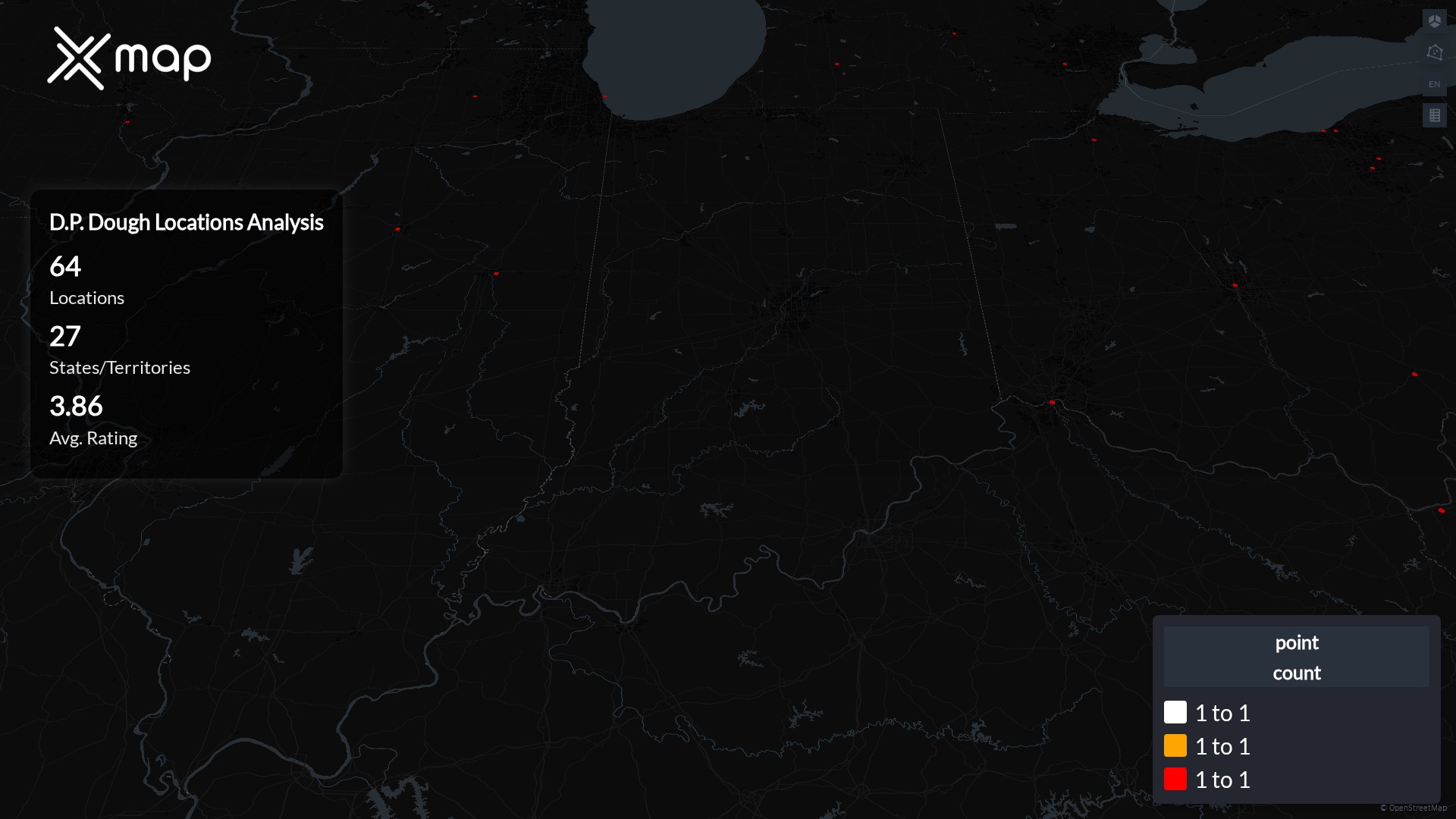 D.P. Dough POI data enables clear measurement of footprint and demand. Analysts can rank states and cities by location count, compare coverage on a per-capita basis, and use traffic scores and review volumes to spot high-performing markets and under-served pockets. The result is an objective view of saturation, growth opportunities, and performance outliers.