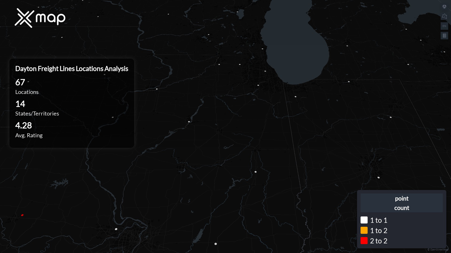 Dayton Freight Lines POI data enables clear measurement of footprint and demand. Analysts can rank states and cities by location count, compare coverage on a per-capita basis, and use traffic scores and review volumes to spot high-performing markets and under-served pockets. The result is an objective view of saturation, growth opportunities, and performance outliers.