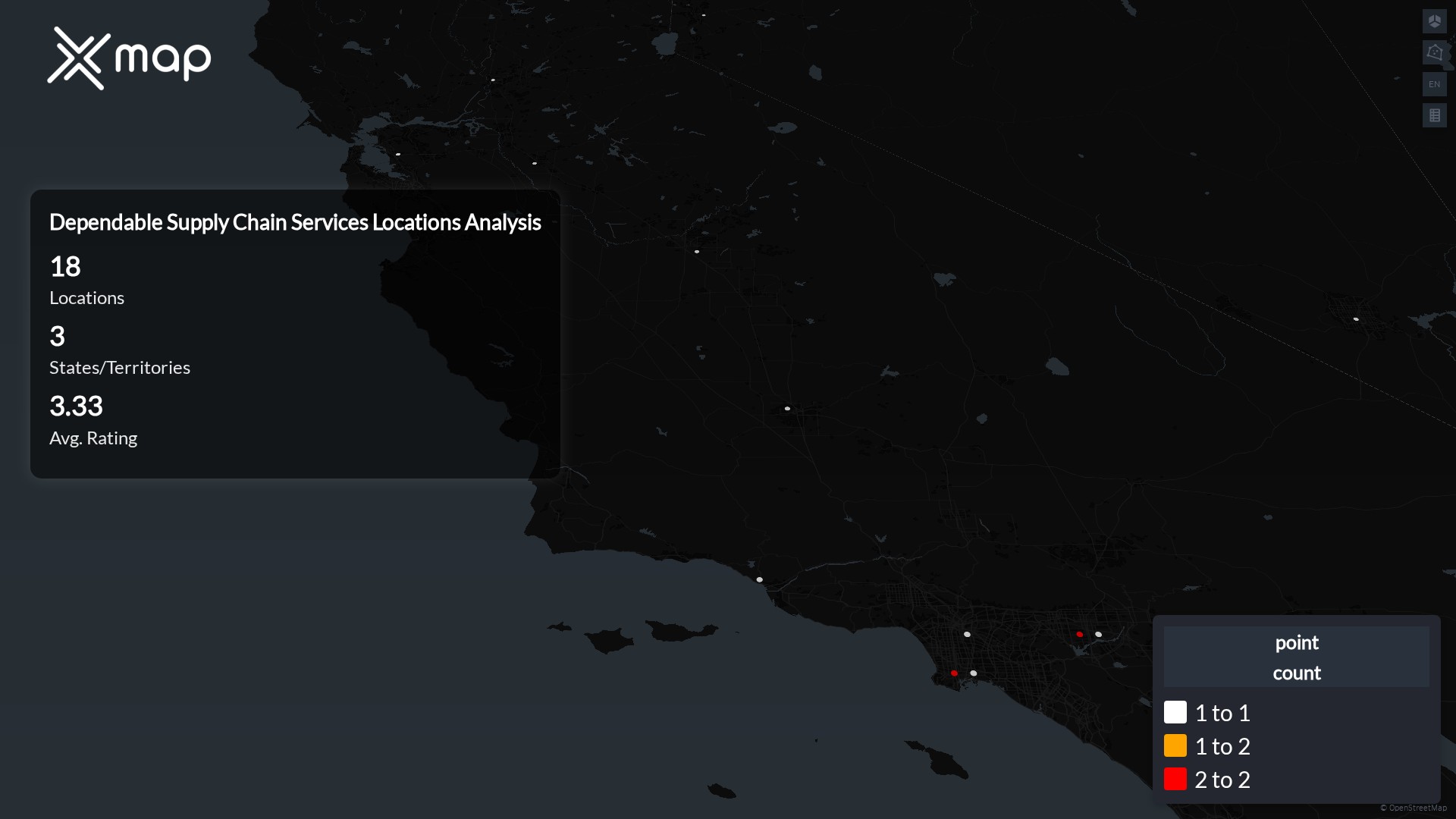 Dependable Supply Chain Services POI data enables clear measurement of footprint and demand. Analysts can rank states and cities by location count, compare coverage on a per-capita basis, and use traffic scores and review volumes to spot high-performing markets and under-served pockets. The result is an objective view of saturation, growth opportunities, and performance outliers.