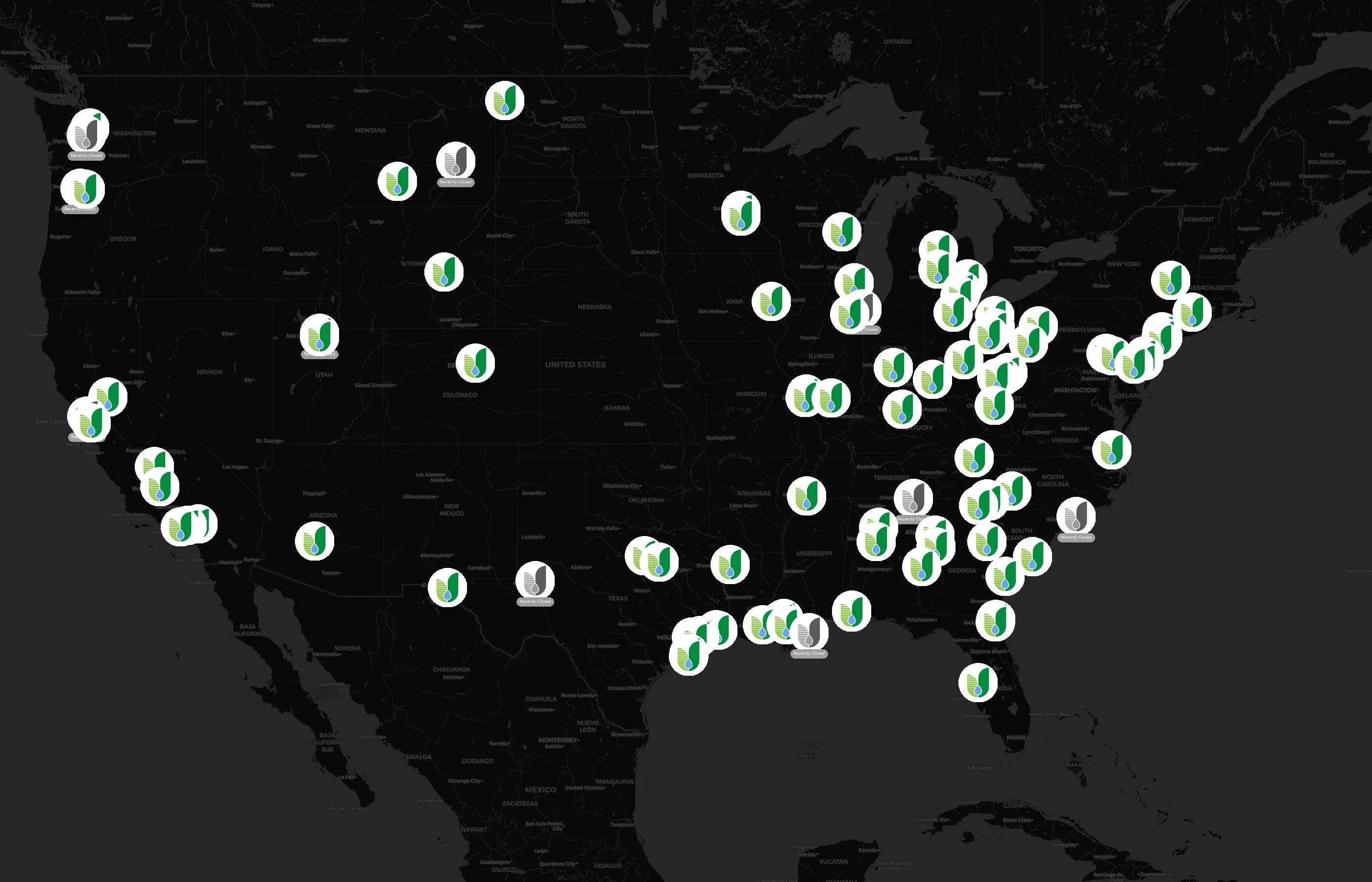 Locations concentrate around major metros such as Harris, Brazoria, Duval, Charleston, and Mobile. The top 10 cities account for 27.5% of U.S. sites.