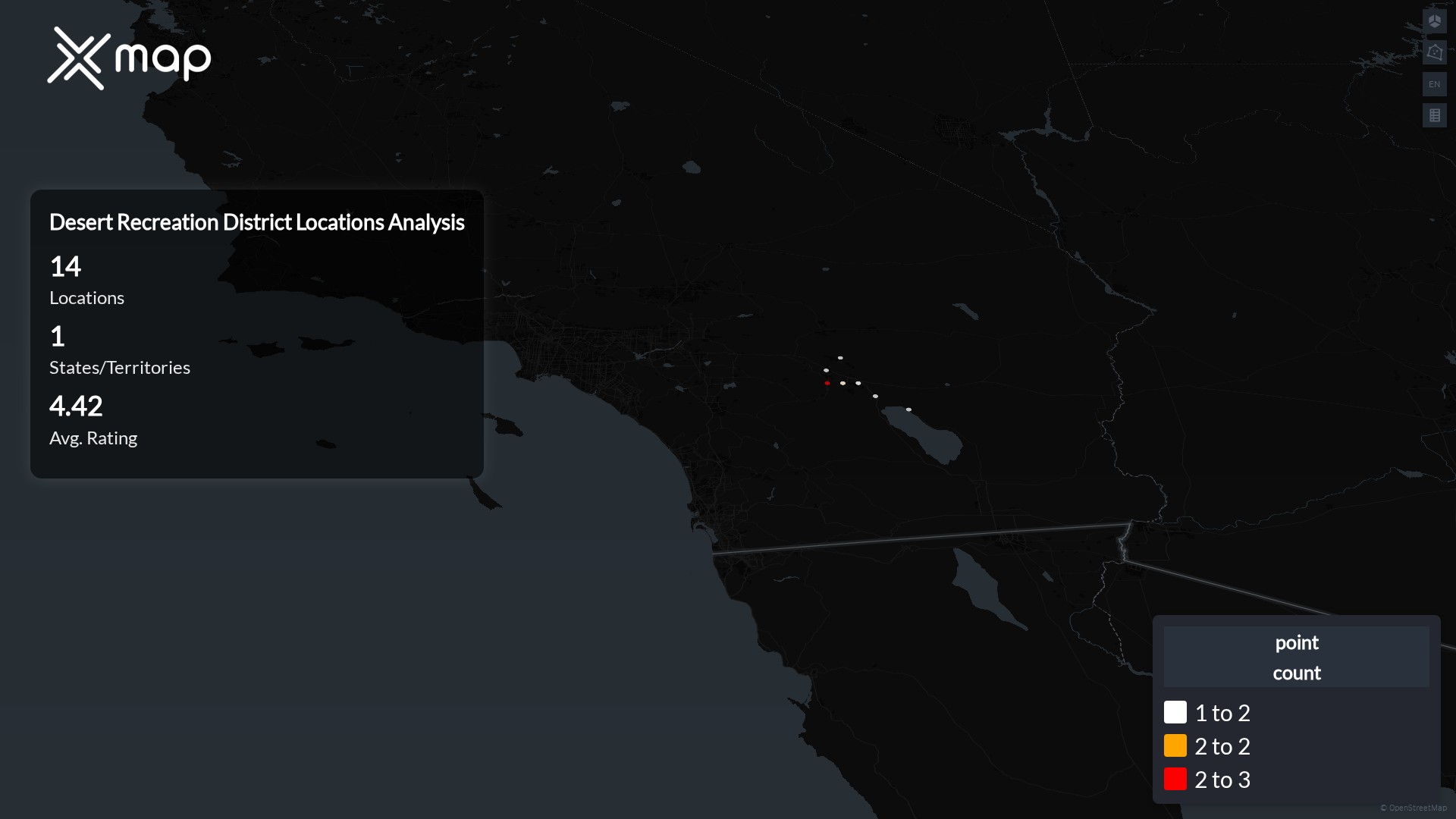 Desert Recreation District POI data enables clear measurement of footprint and demand. Analysts can rank states and cities by location count, compare coverage on a per-capita basis, and use traffic scores and review volumes to spot high-performing markets and under-served pockets. The result is an objective view of saturation, growth opportunities, and performance outliers.