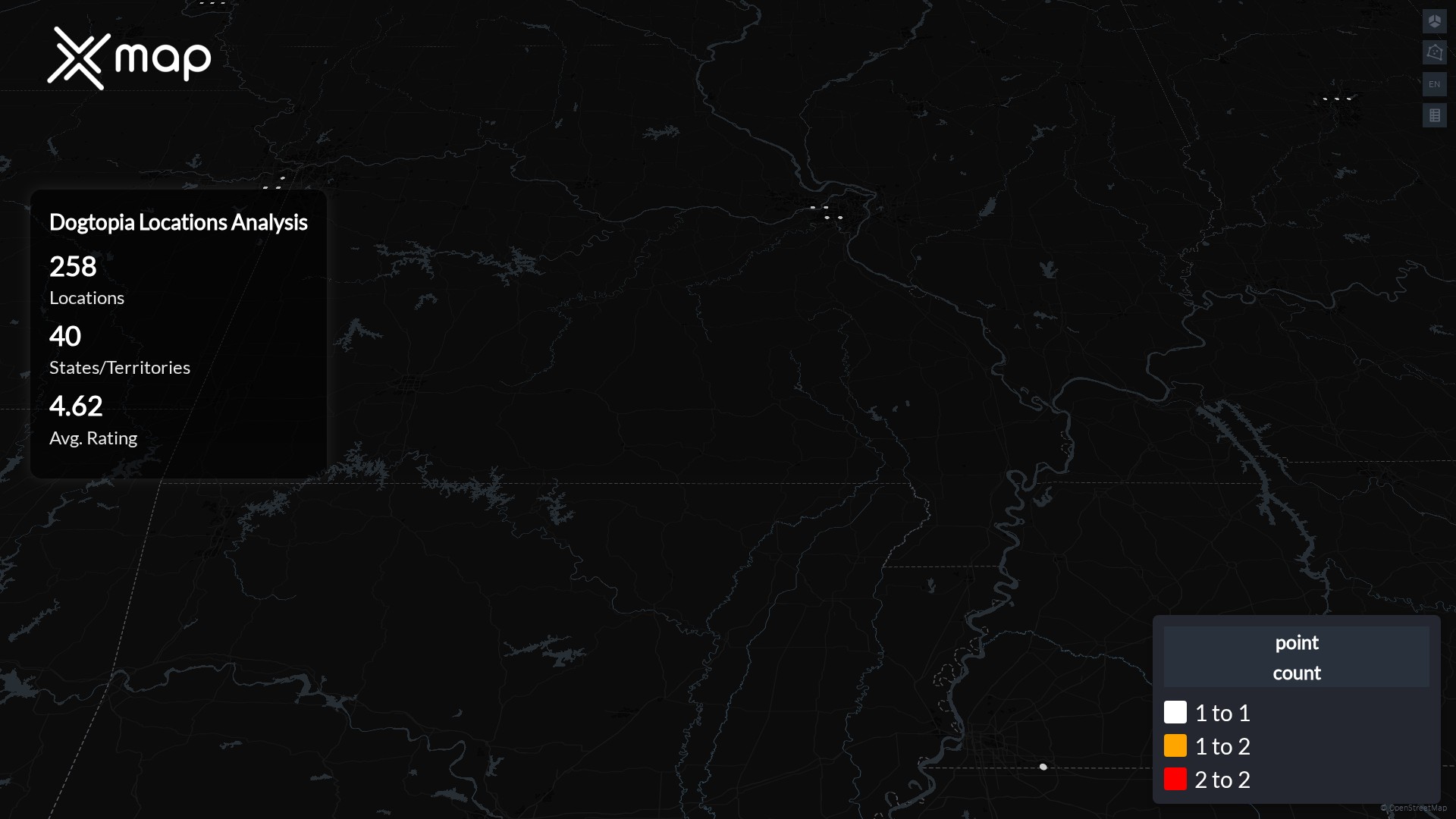 Dogtopia POI data enables clear measurement of footprint and demand. Analysts can rank states and cities by location count, compare coverage on a per-capita basis, and use traffic scores and review volumes to spot high-performing markets and under-served pockets. The result is an objective view of saturation, growth opportunities, and performance outliers.