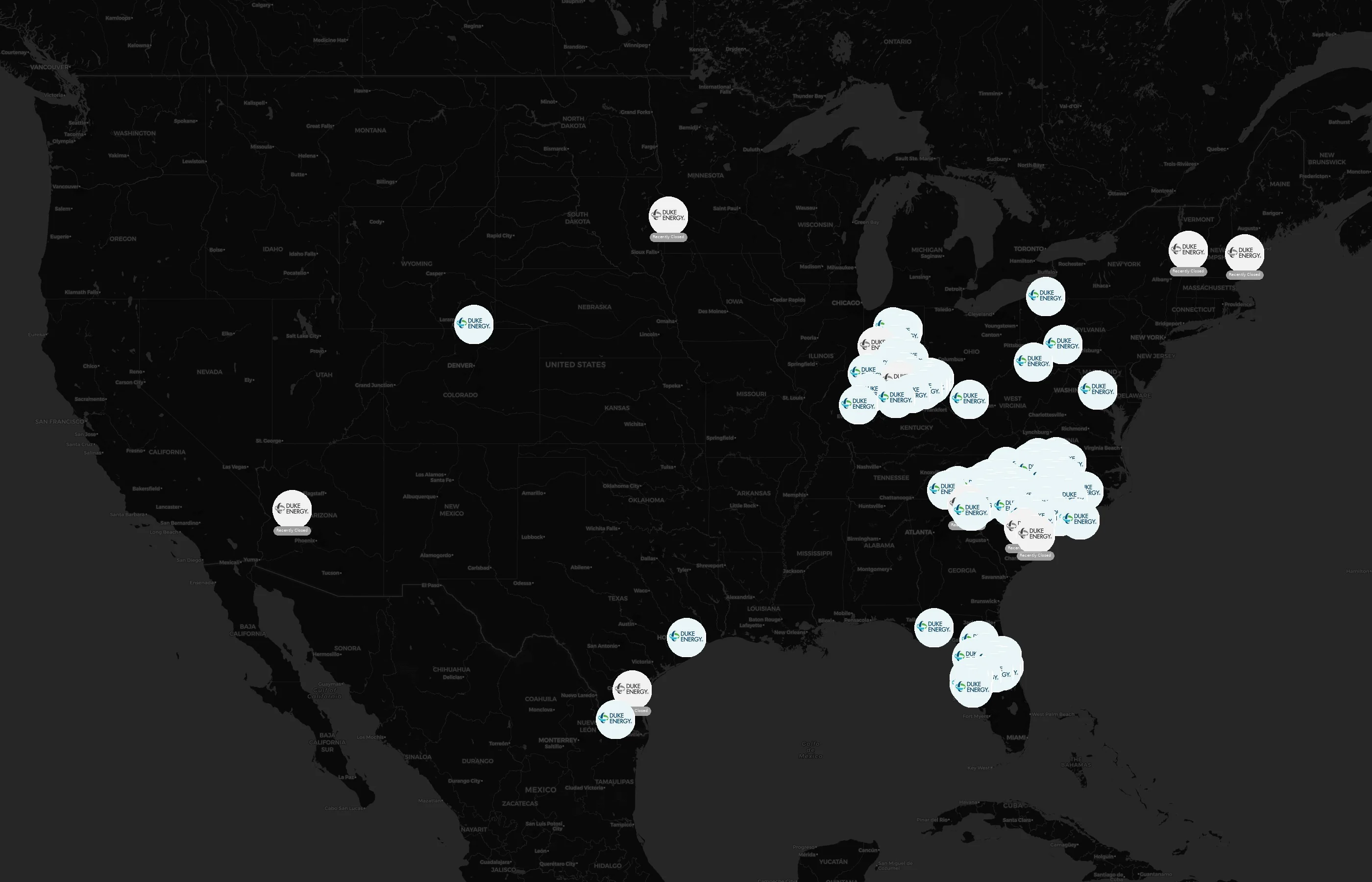 Street-level clusters show corridors where multiple Duke Energy locations sit within the same neighborhood indicating strong local presence and coherence. Duke Energy operates a total of 136 nationwide.