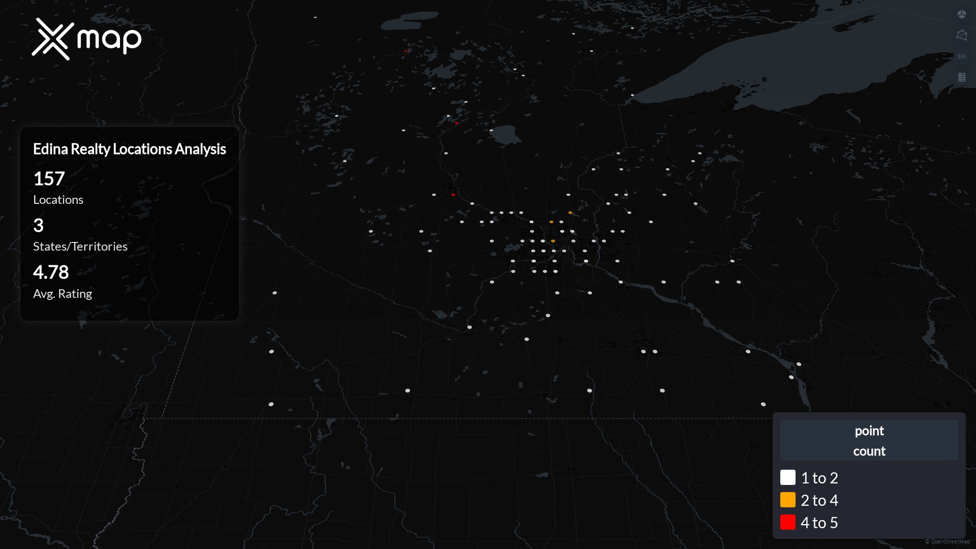 Street-level clusters show corridors where multiple Edina Realty locations sit within the same neighborhood indicating strong local presence and coherence. Edina Realty operates a total of 157 nationwide.