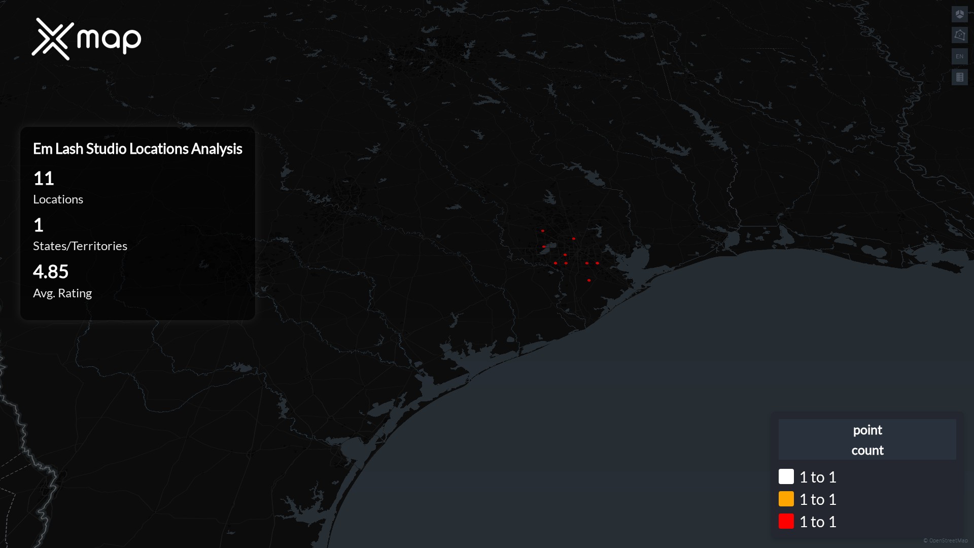 Street-level clusters show corridors where multiple Em Lash Studio locations sit within the same neighborhood indicating strong local presence and coherence. Em Lash Studio operates a total of 11 nationwide.