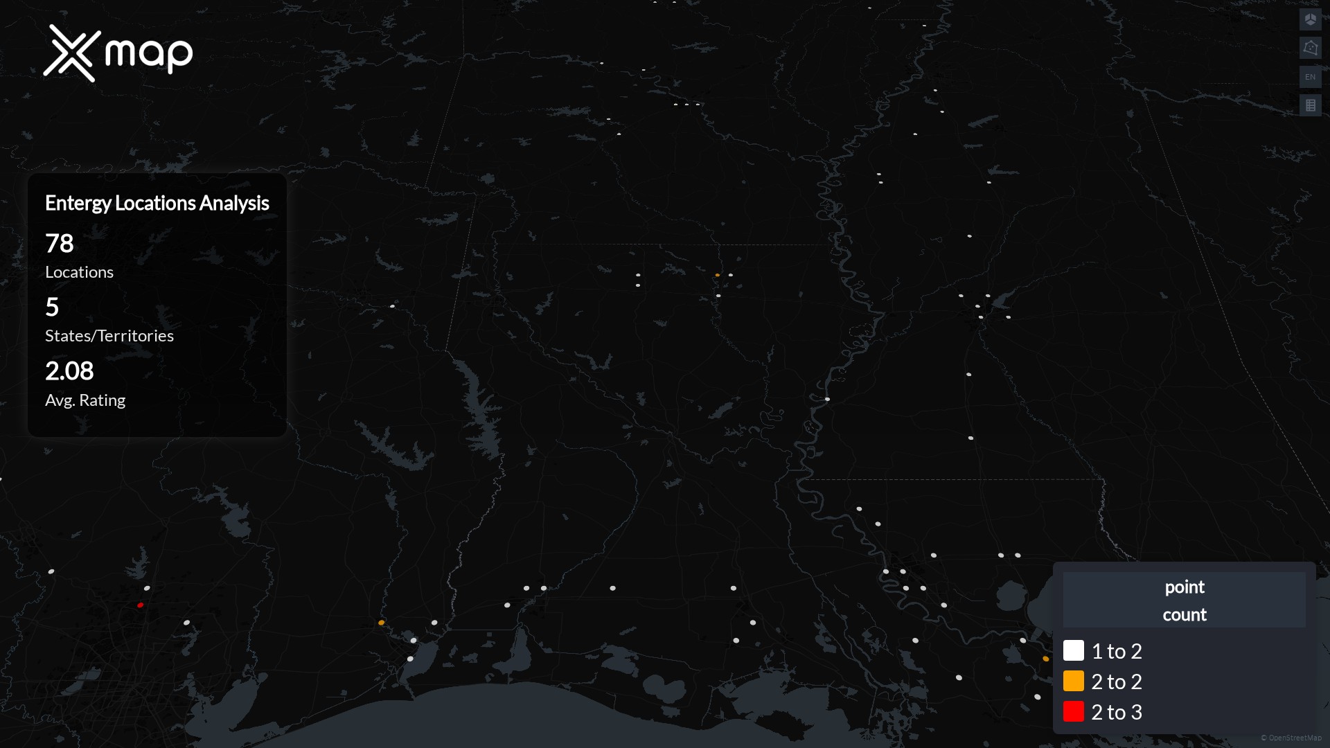 Street-level clusters show corridors where multiple Entergy locations sit within the same neighborhood indicating strong local presence and coherence. Entergy operates a total of 78 nationwide.