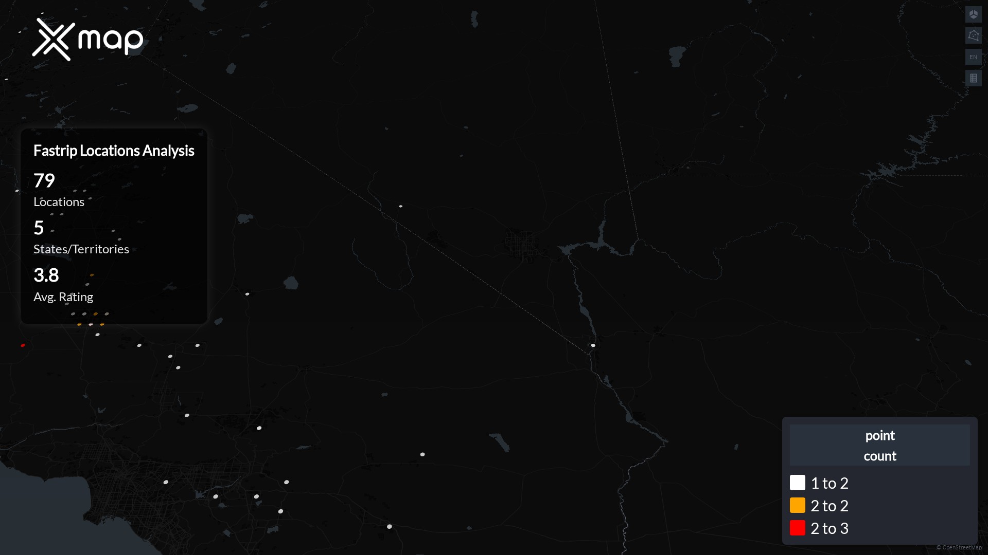 Fastrip POI data enables clear measurement of footprint and demand. Analysts can rank states and cities by location count, compare coverage on a per-capita basis, and use traffic scores and review volumes to spot high-performing markets and under-served pockets. The result is an objective view of saturation, growth opportunities, and performance outliers.