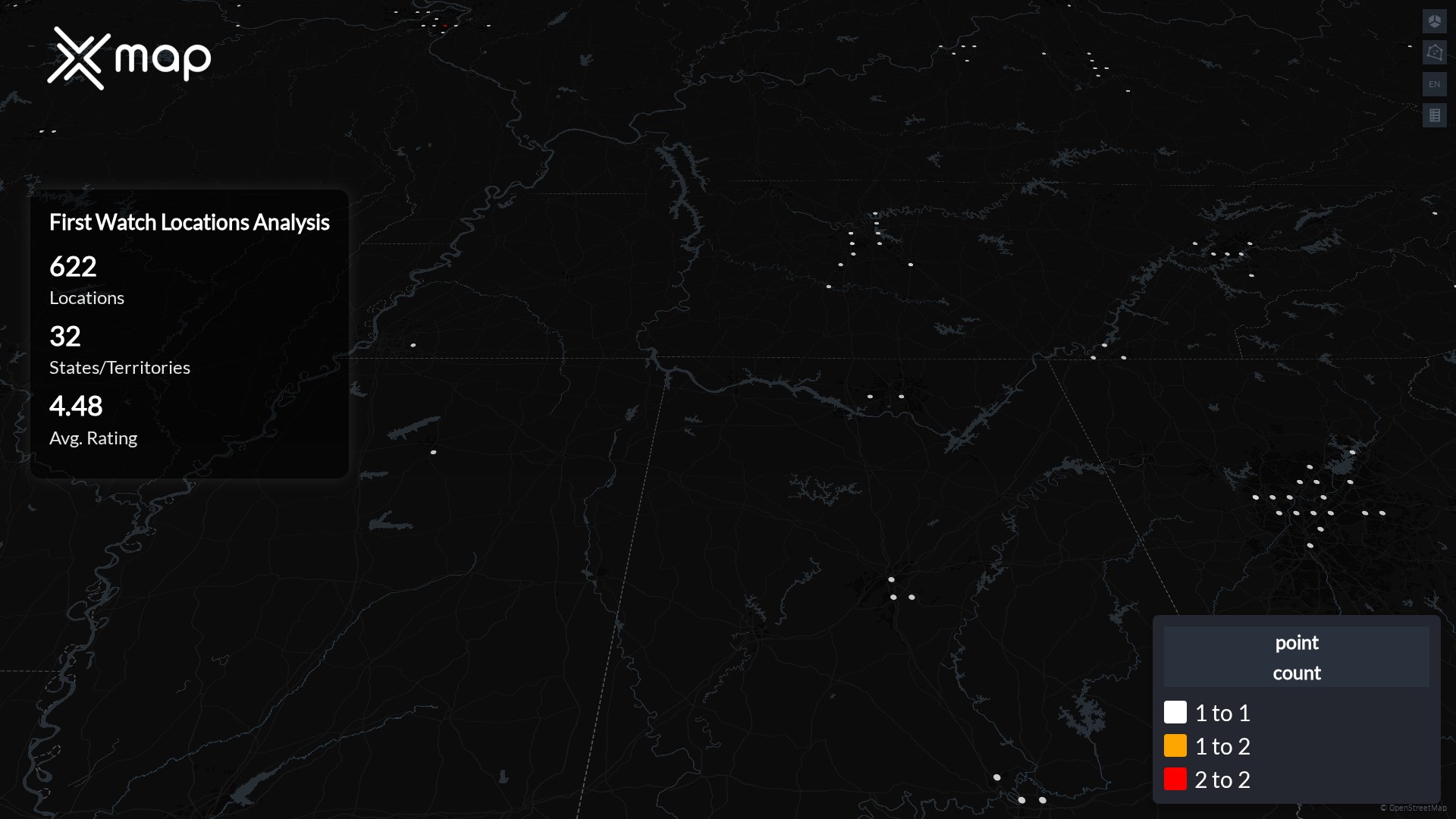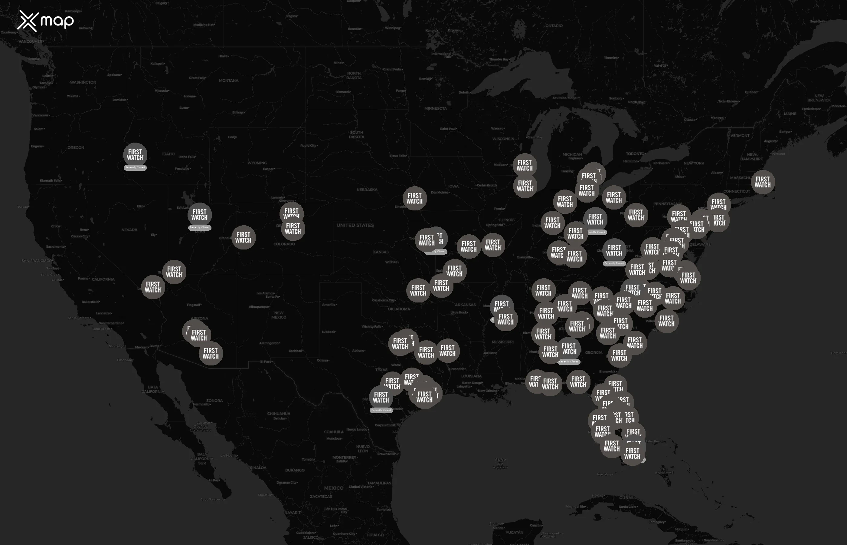 Street-level clusters show corridors where multiple First Watch locations sit within the same neighborhood indicating strong local presence and coherence. First Watch operates a total of 622 nationwide.