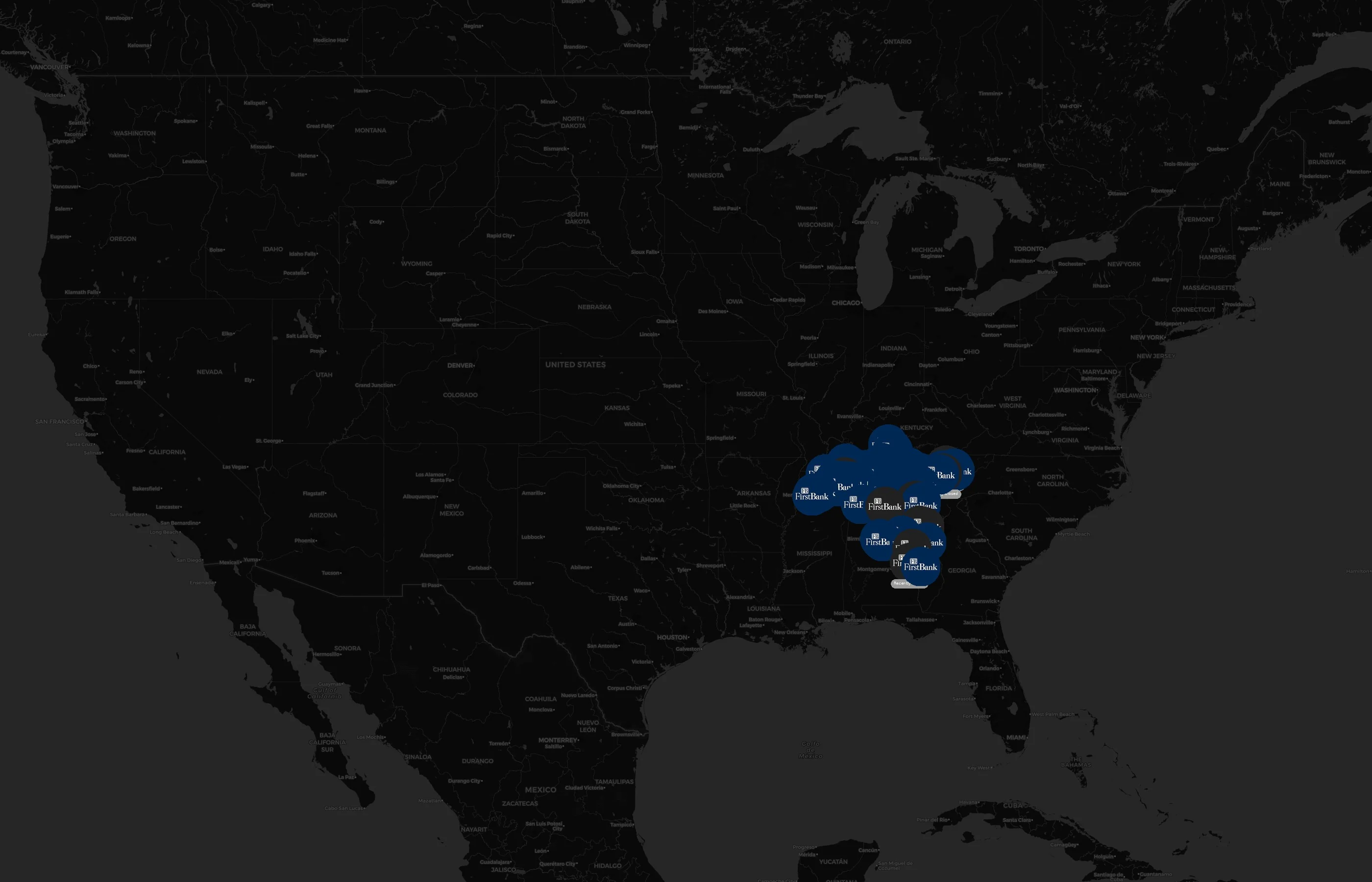 Street-level clusters show corridors where multiple FirstBank locations sit within the same neighborhood indicating strong local presence and coherence. FirstBank operates a total of 106 nationwide.