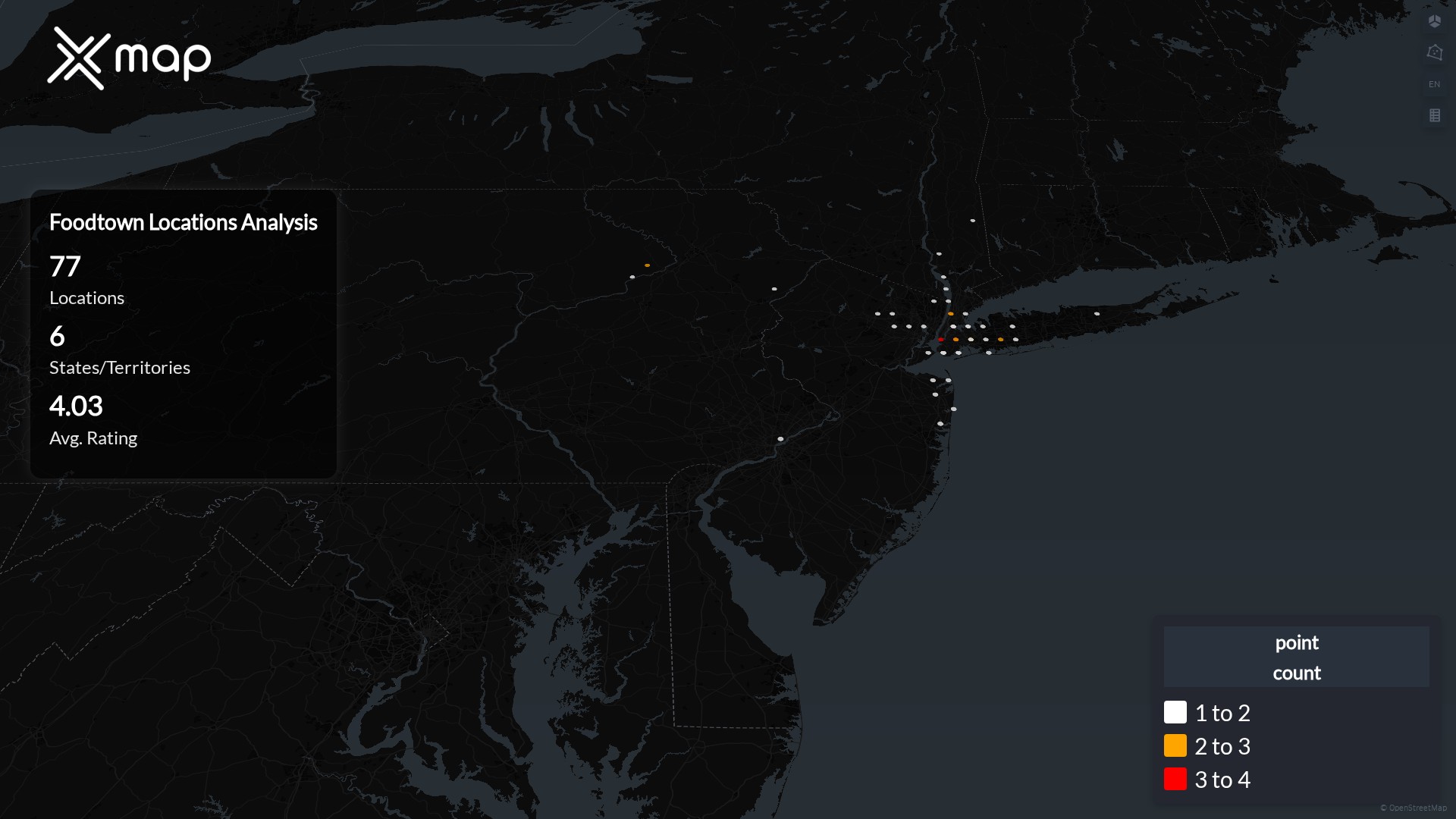 Street-level clusters show corridors where multiple Foodtown locations sit within the same neighborhood indicating strong local presence and coherence. Foodtown operates a total of 77 nationwide.