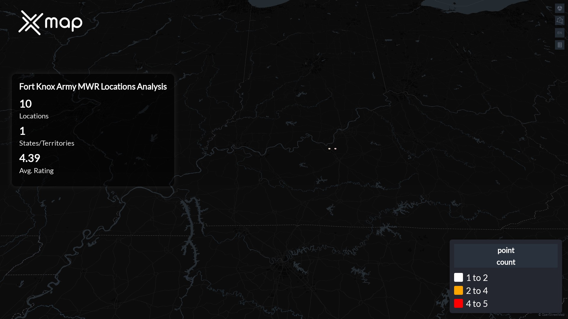 Street-level clusters show corridors where multiple Fort Knox Army MWR locations sit within the same neighborhood indicating strong local presence and coherence. Fort Knox Army MWR operates a total of 10 nationwide.