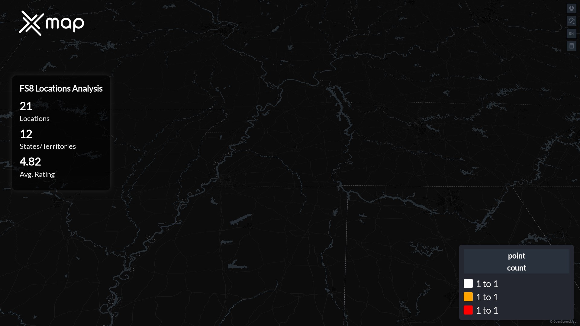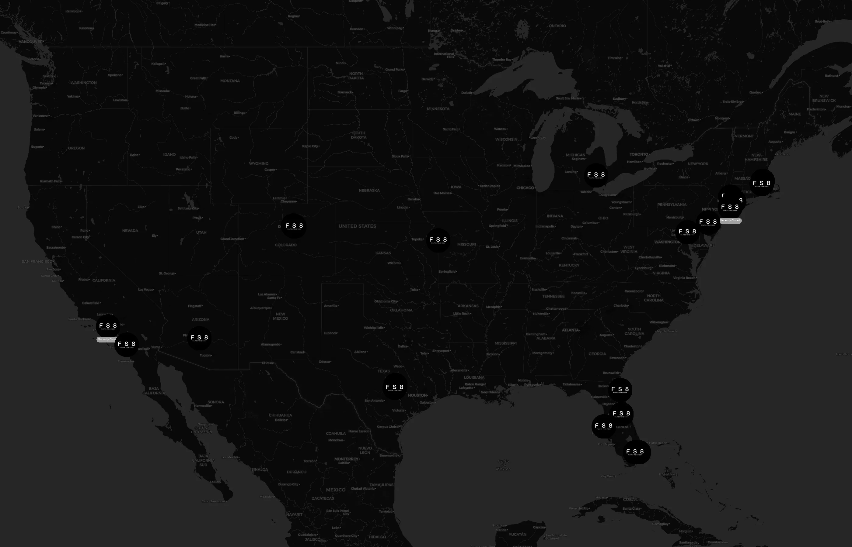 Street-level clusters show corridors where multiple FS8 locations sit within the same neighborhood indicating strong local presence and coherence. FS8 operates a total of 21 nationwide.