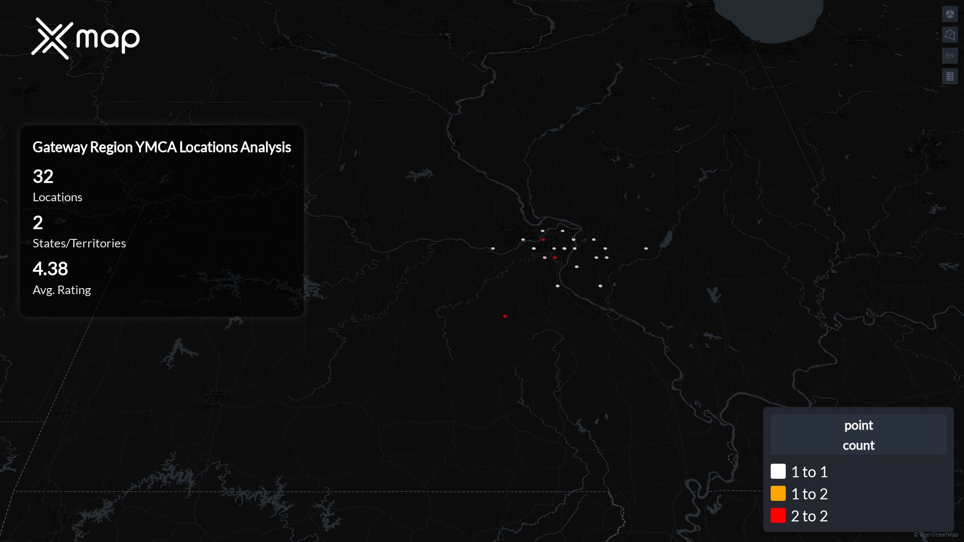 Gateway Region YMCA operates 32 United States of America locations across 2 states. Largest clusters are in Missouri and Illinois; the top 10 states contain 100.0% of sites. Coverage is thinner in Missouri and Illinois.