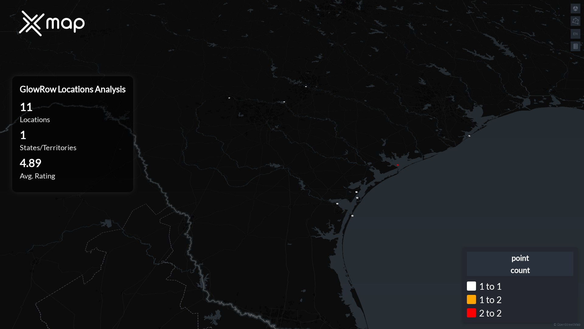 Street-level clusters show corridors where multiple GlowRow locations sit within the same neighborhood indicating strong local presence and coherence. GlowRow operates a total of 11 nationwide.