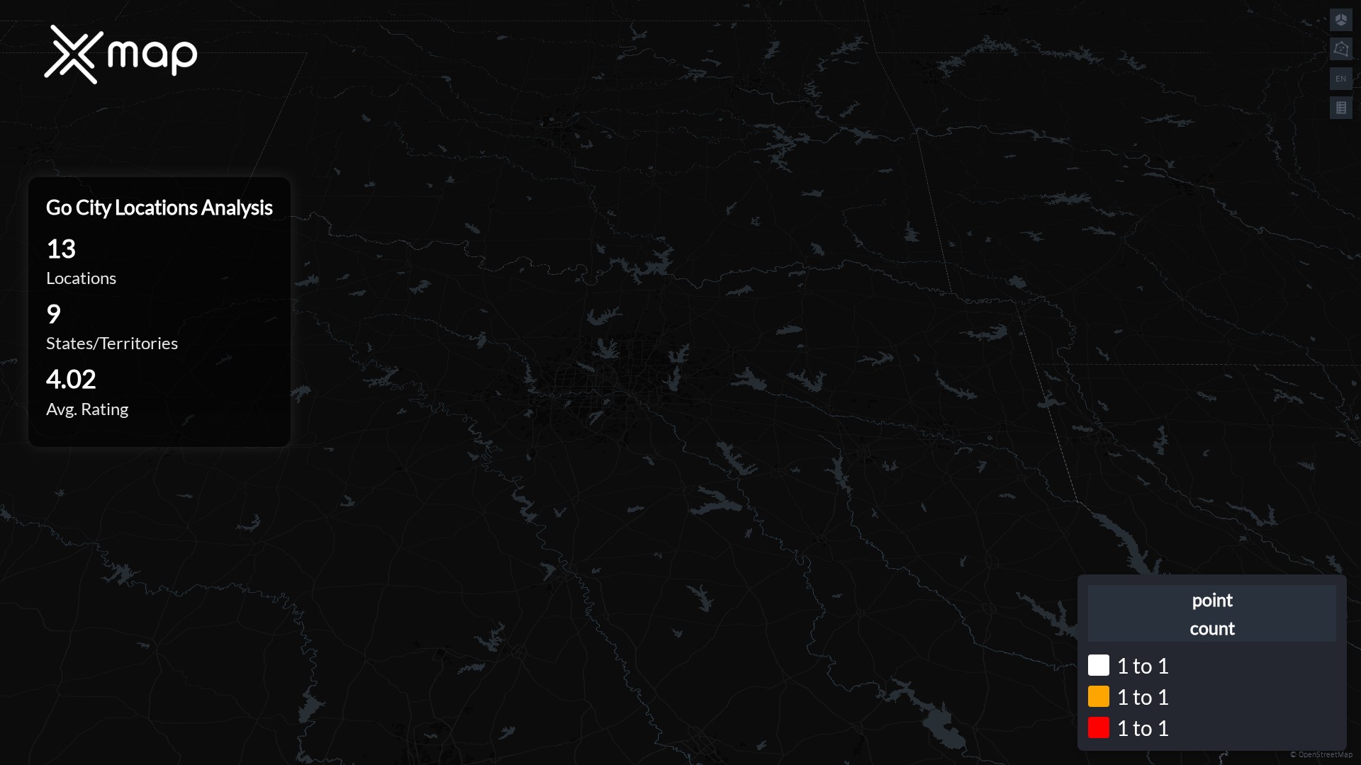 Street-level clusters show corridors where multiple Go City locations sit within the same neighborhood indicating strong local presence and coherence. Go City operates a total of 13 nationwide.