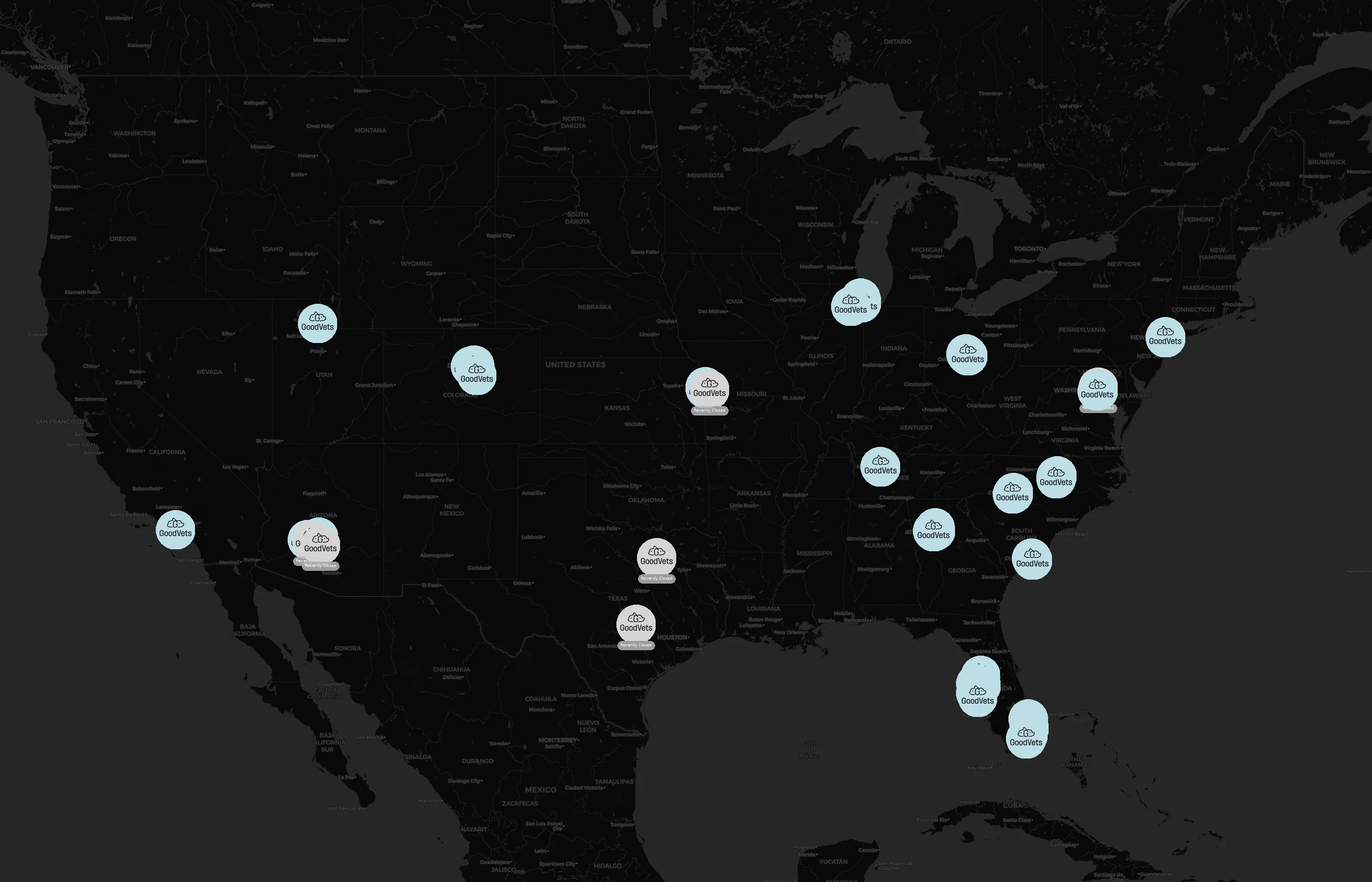 The complete dataset of GoodVets locations across the United States of America is available for download, including coordinates, traffic patterns, and operational status.
