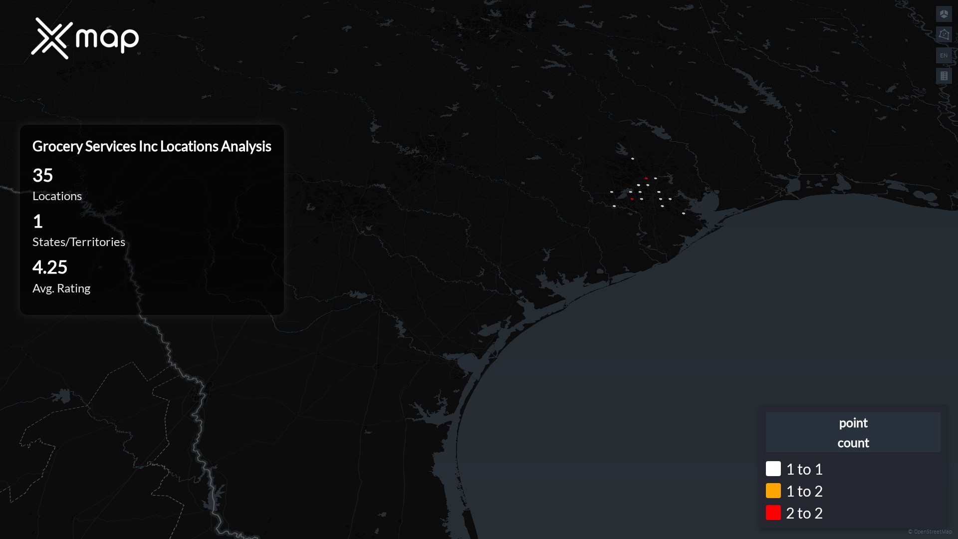 Grocery Services Inc operates exclusively in Texas with all 35 of its locations situated there, representing 100% of its presence in the United States. Texas also ranks as the best access and most stretched state, with one location serving approximately 835,524 people. The top three and top ten states both hold a 100% share of the brand's locations.