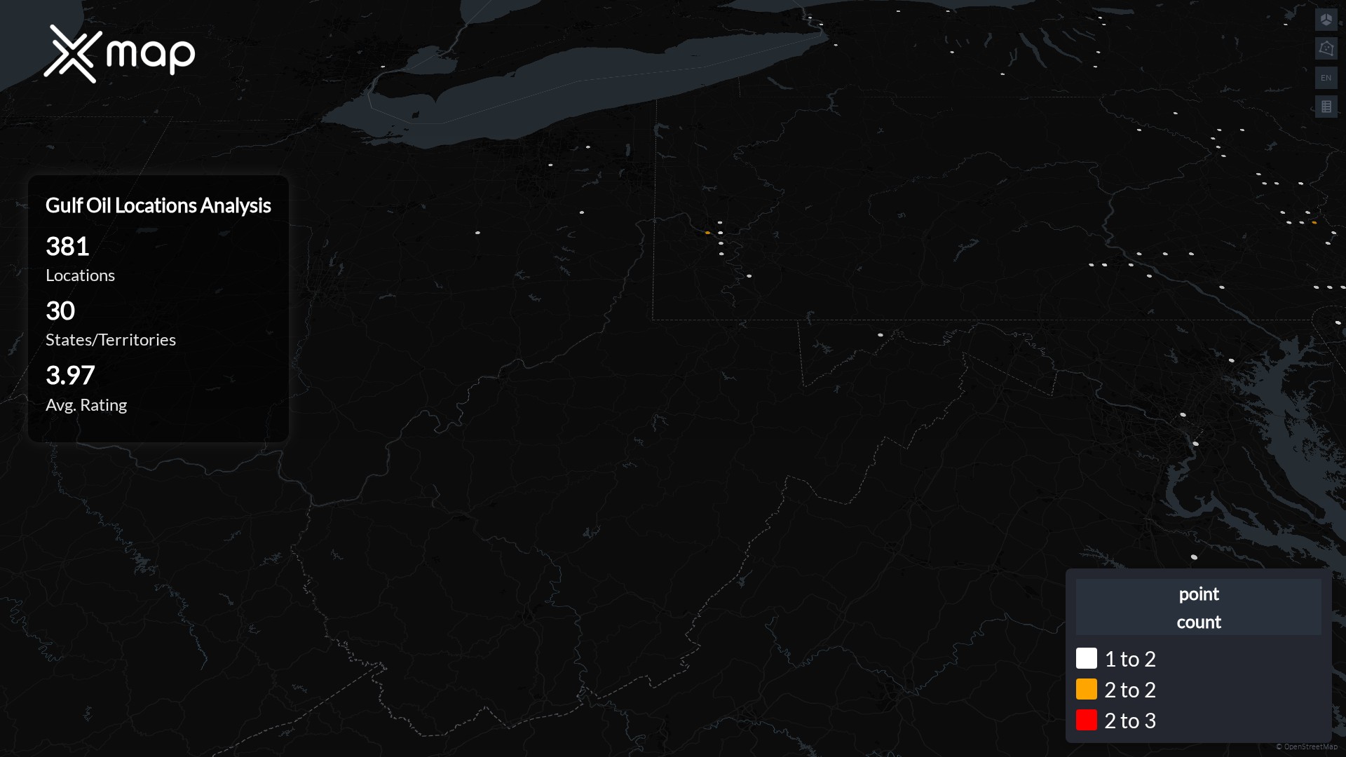 Gulf Oil POI data enables clear measurement of footprint and demand. Analysts can rank states and cities by location count, compare coverage on a per-capita basis, and use traffic scores and review volumes to spot high-performing markets and under-served pockets. The result is an objective view of saturation, growth opportunities, and performance outliers.