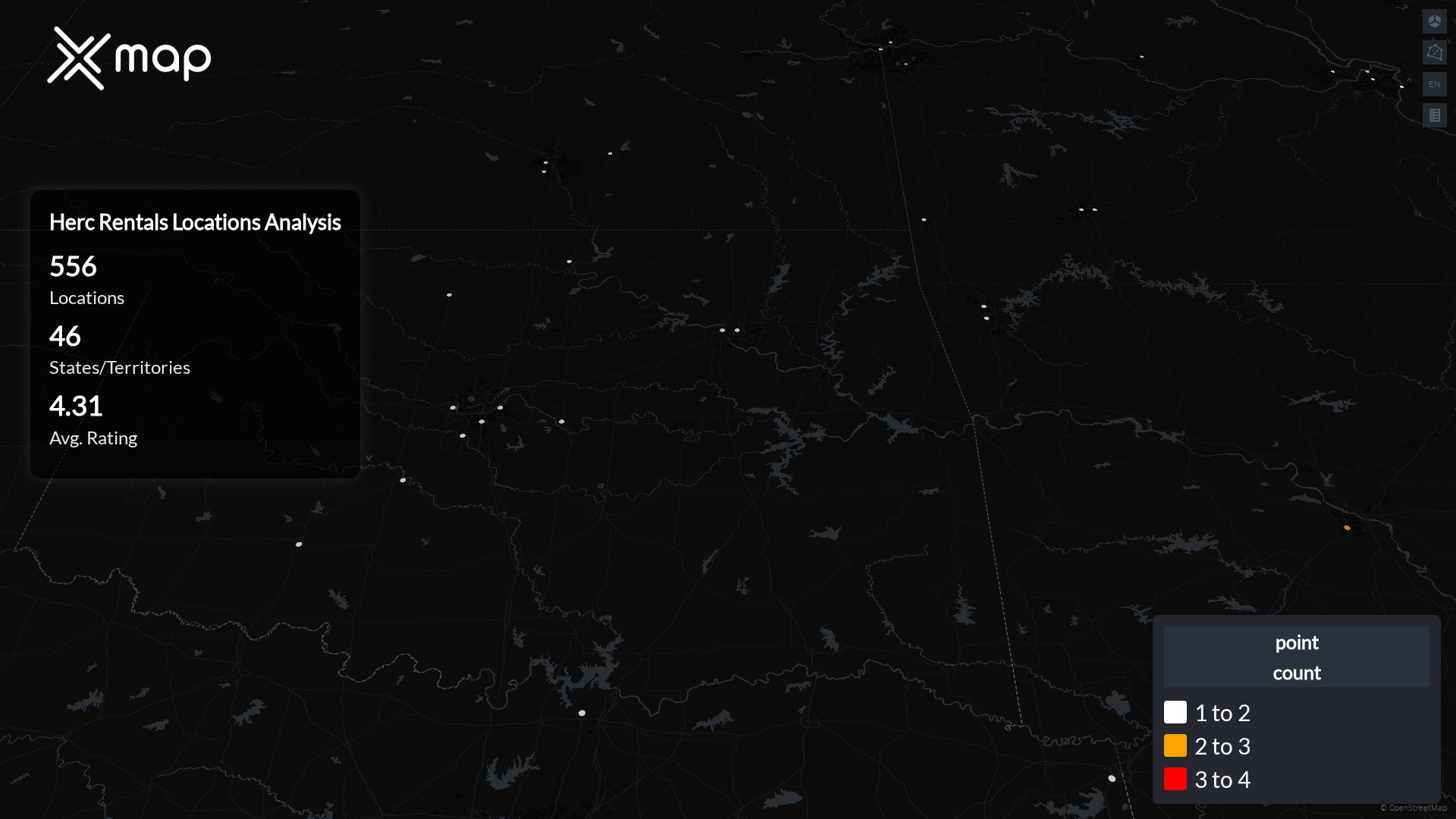 Herc Rentals POI data enables clear measurement of footprint and demand. Analysts can rank states and cities by location count, compare coverage on a per-capita basis, and use traffic scores and review volumes to spot high-performing markets and under-served pockets. The result is an objective view of saturation, growth opportunities, and performance outliers.