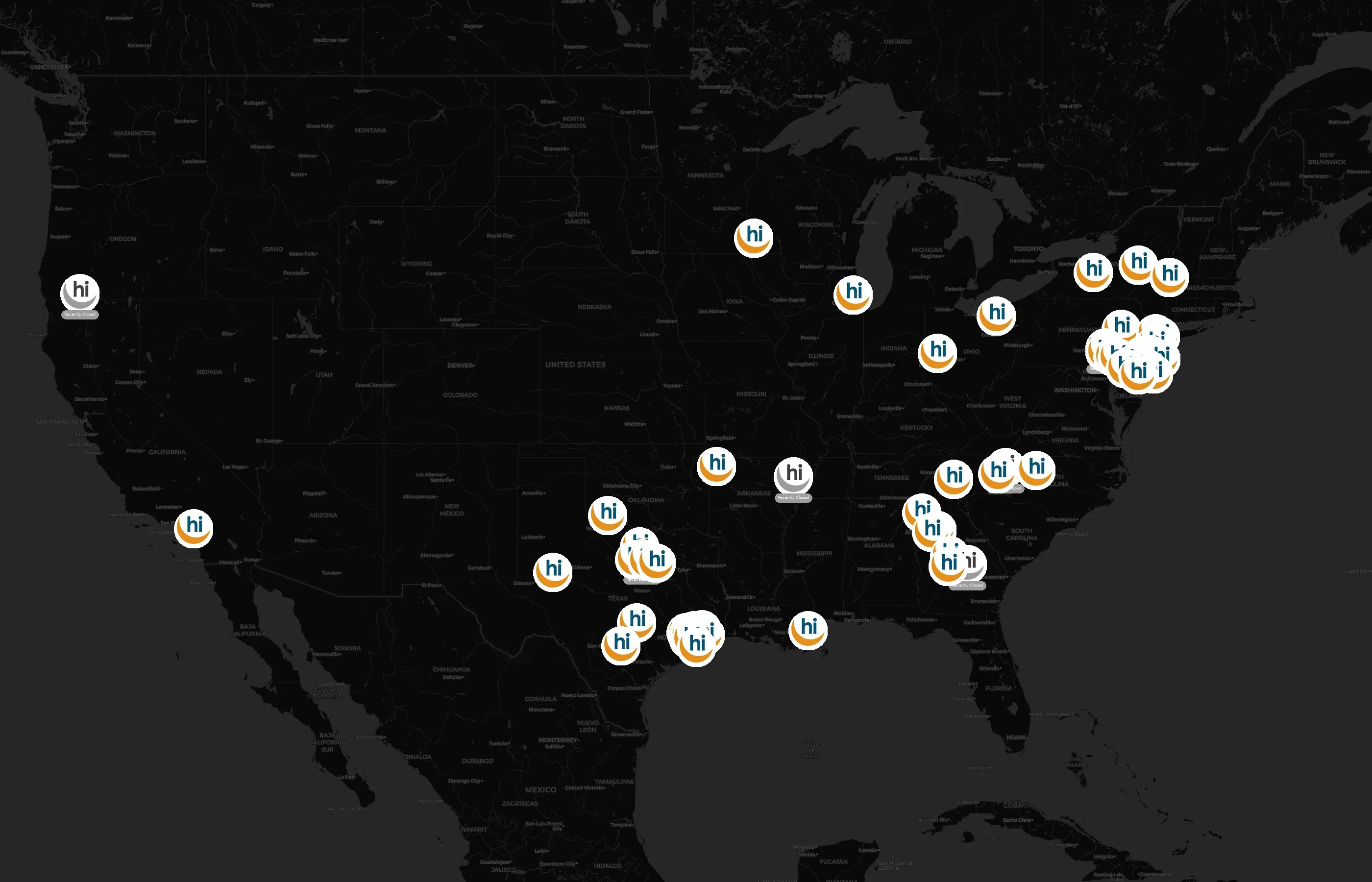 Street-level clusters show corridors where multiple HI Hotels locations sit within the same neighborhood indicating strong local presence and coherence. HI Hotels operates a total of 61 nationwide.