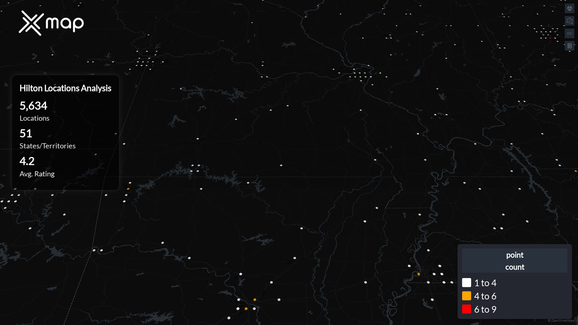 Street-level clusters show corridors where multiple Hilton locations sit within the same neighborhood indicating strong local presence and coherence. Hilton operates a total of 5634 nationwide.