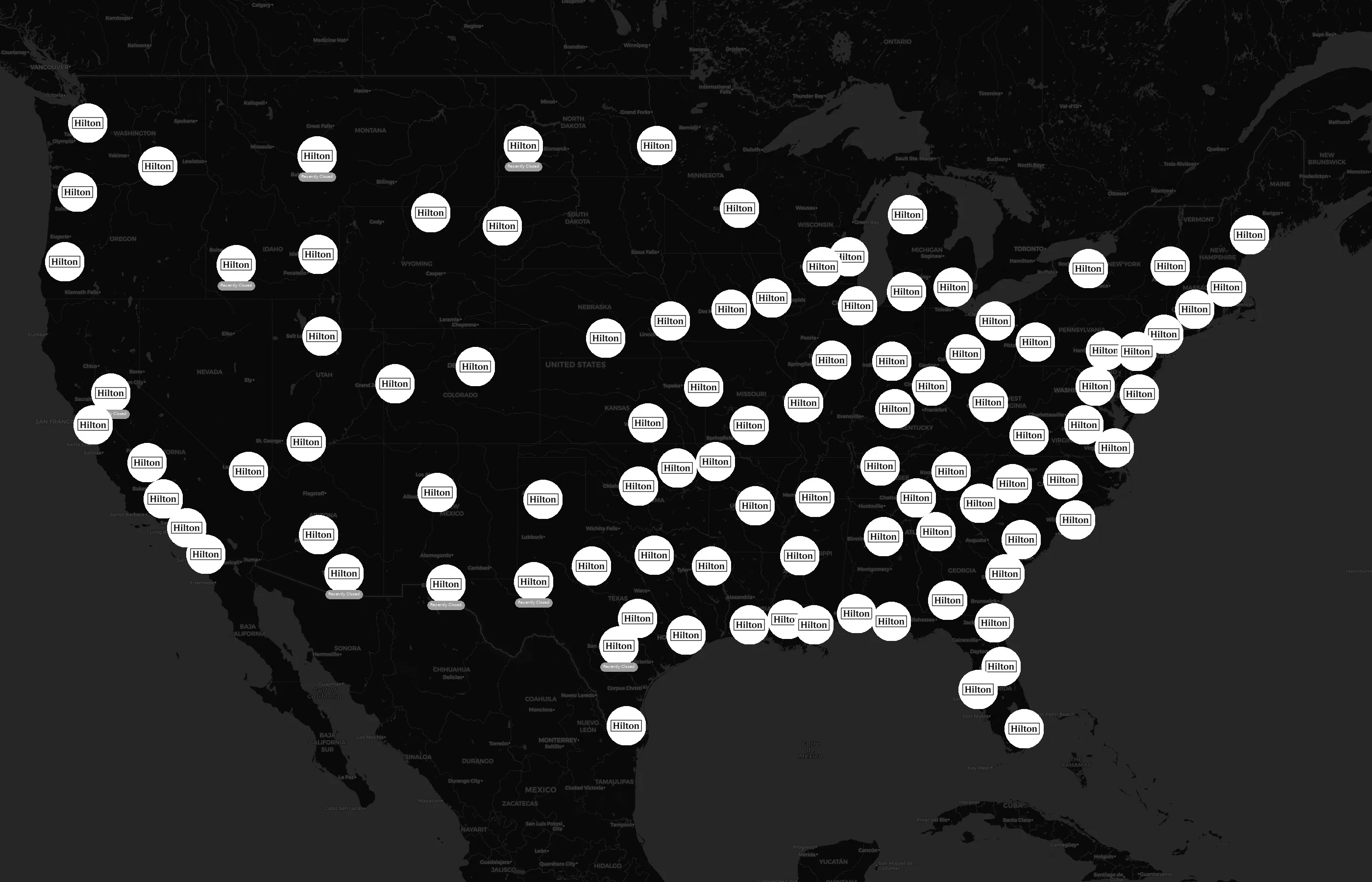 The complete dataset of Hilton locations across the United States of America is available for download, including coordinates, traffic patterns, and operational status.
