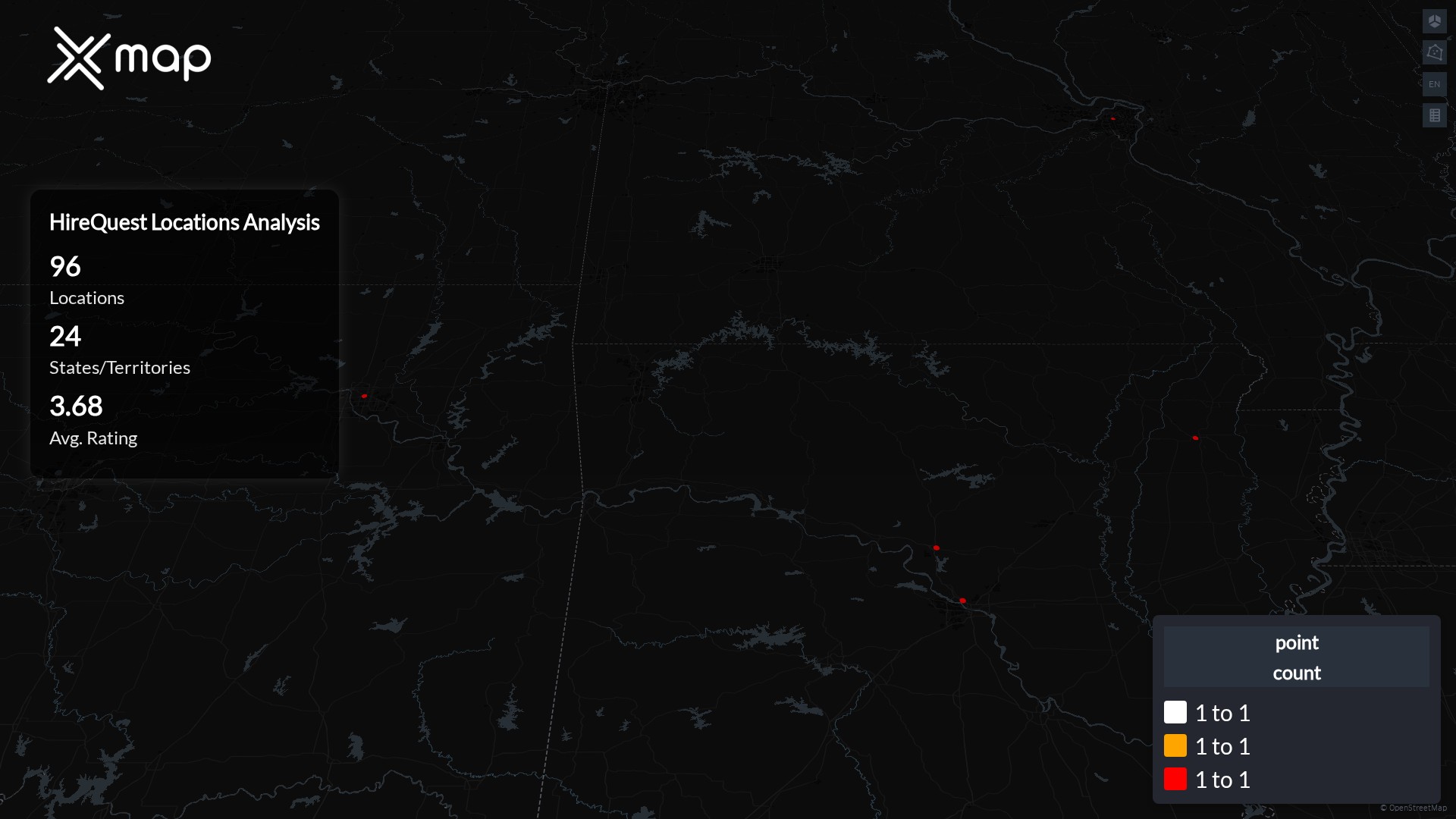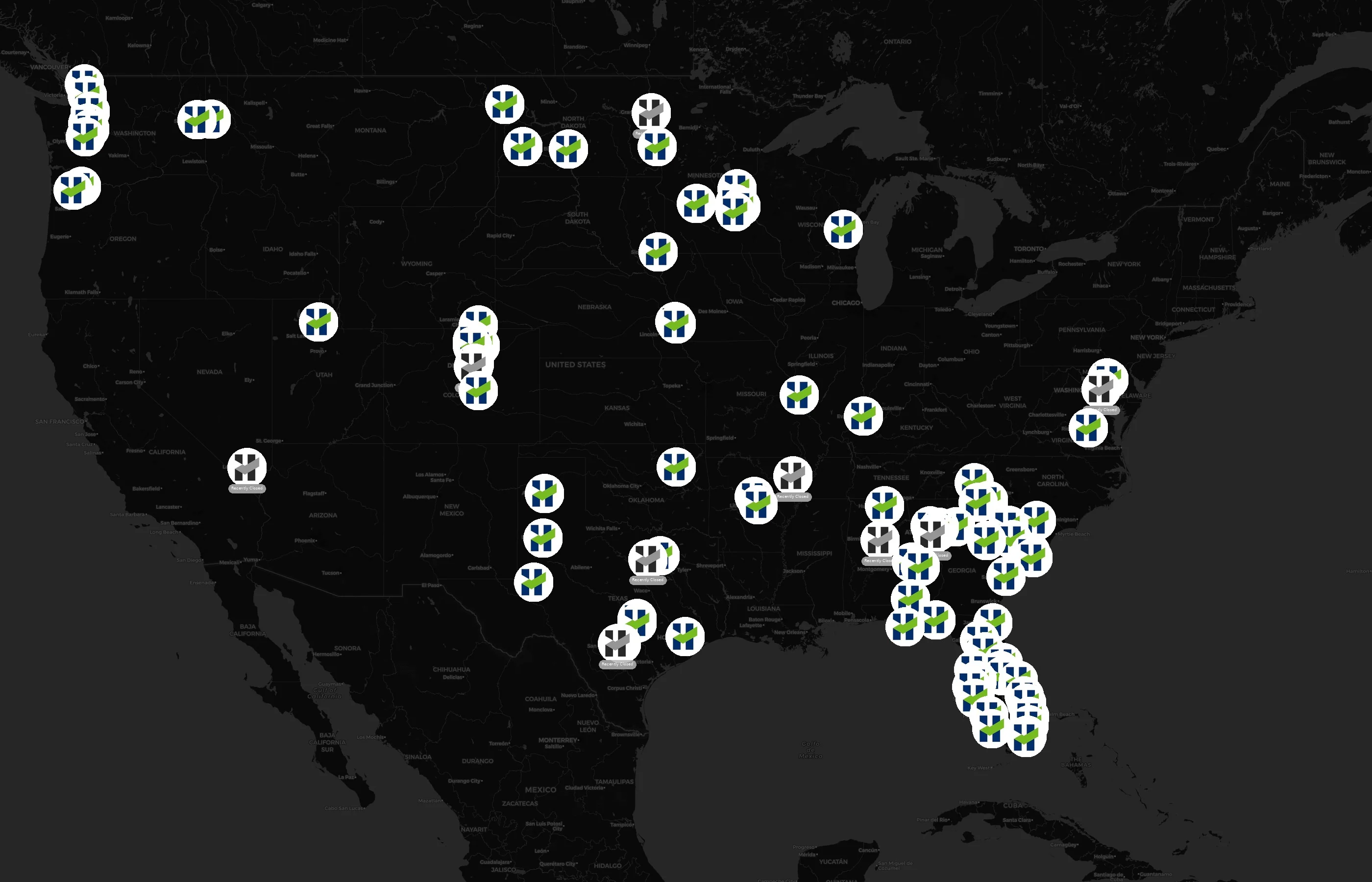 Street-level clusters show corridors where multiple HireQuest locations sit within the same neighborhood indicating strong local presence and coherence. HireQuest operates a total of 96 nationwide.