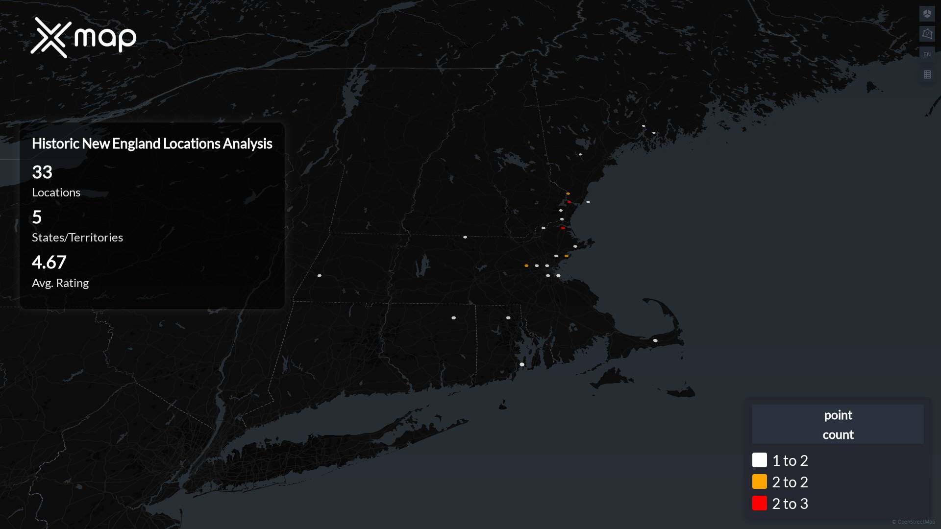 Street-level clusters show corridors where multiple Historic New England locations sit within the same neighborhood indicating strong local presence and coherence. Historic New England operates a total of 33 nationwide.