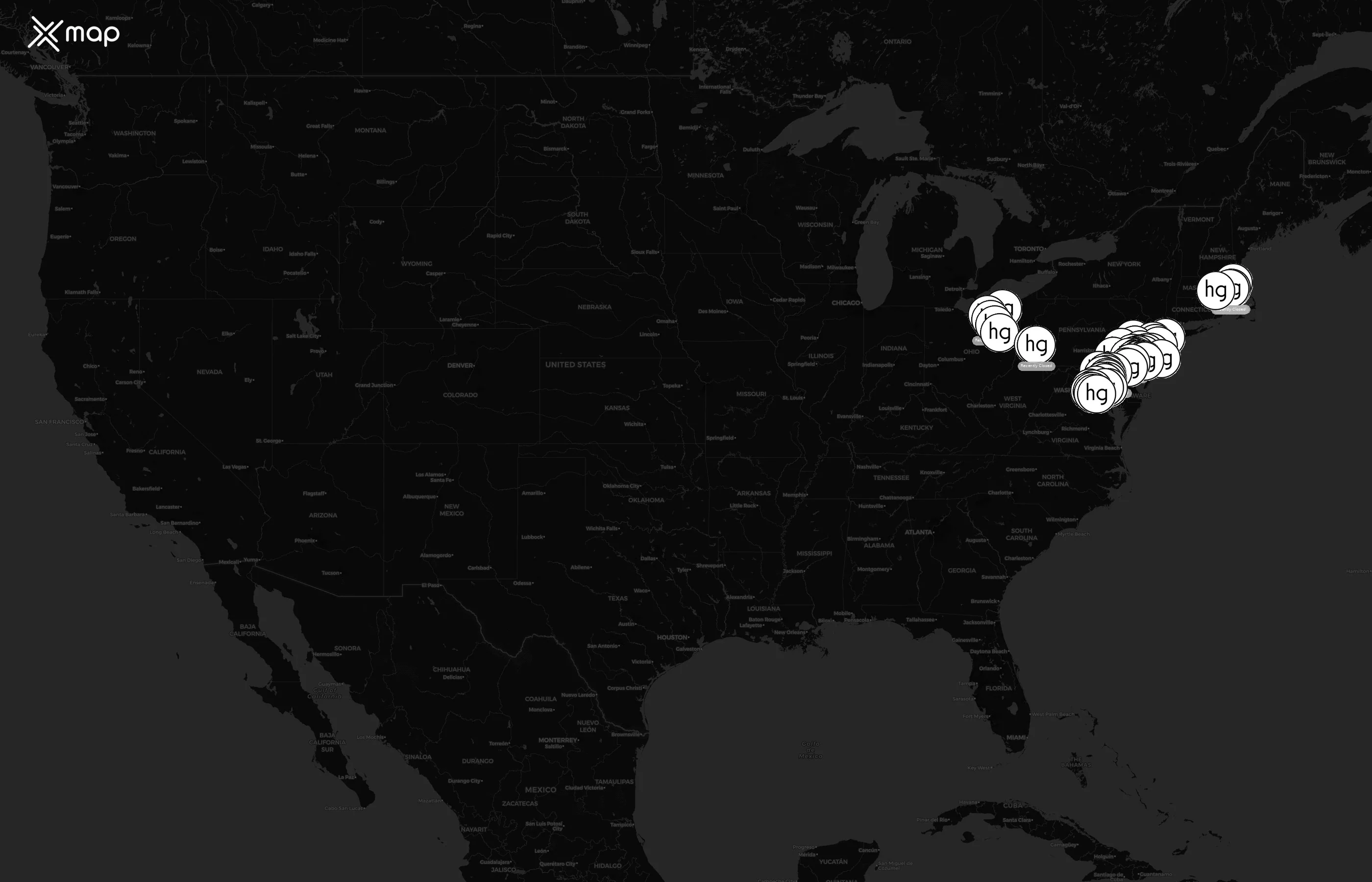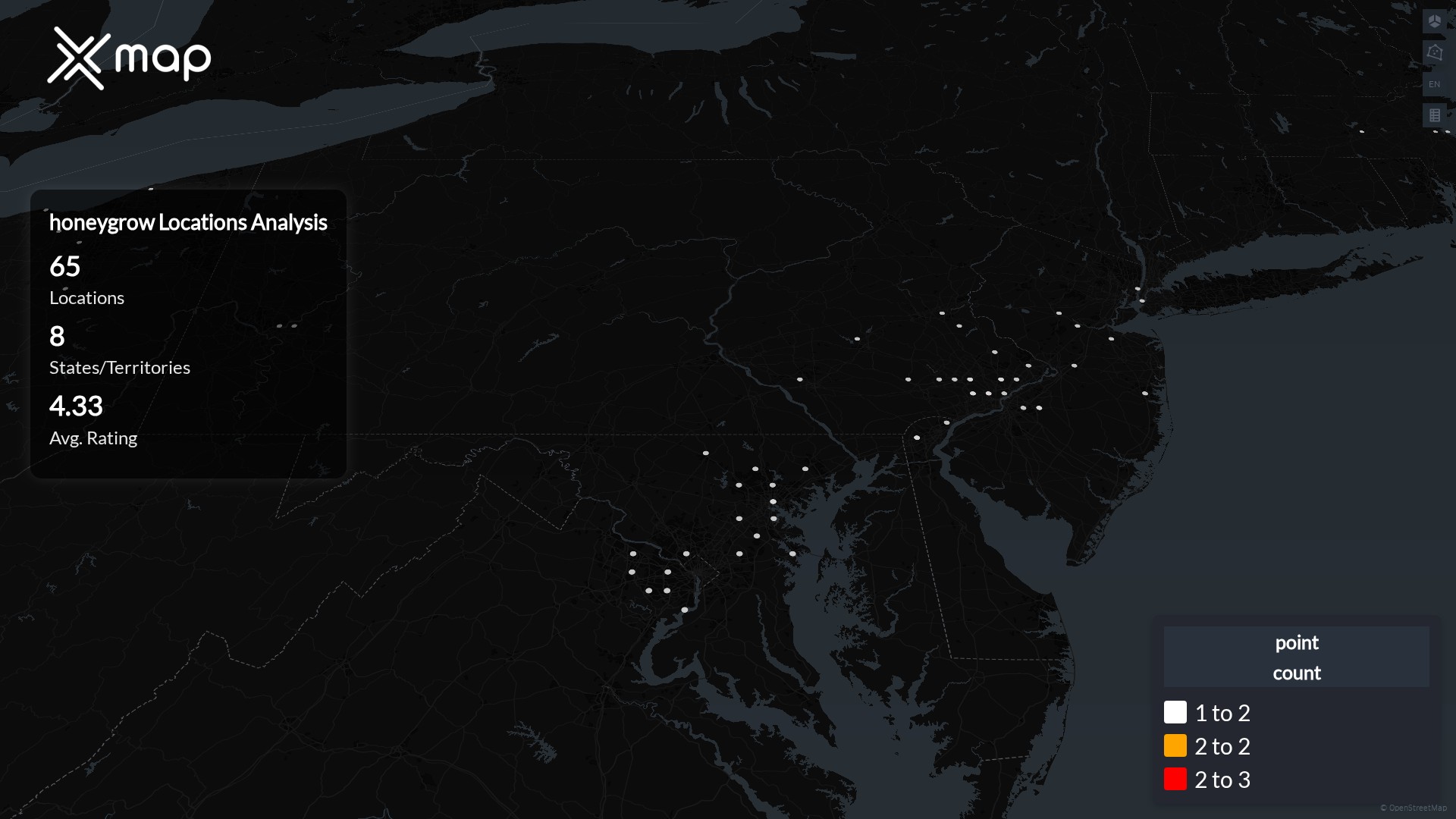 Street-level clusters show corridors where multiple honeygrow locations sit within the same neighborhood indicating strong local presence and coherence. honeygrow operates a total of 65 nationwide.