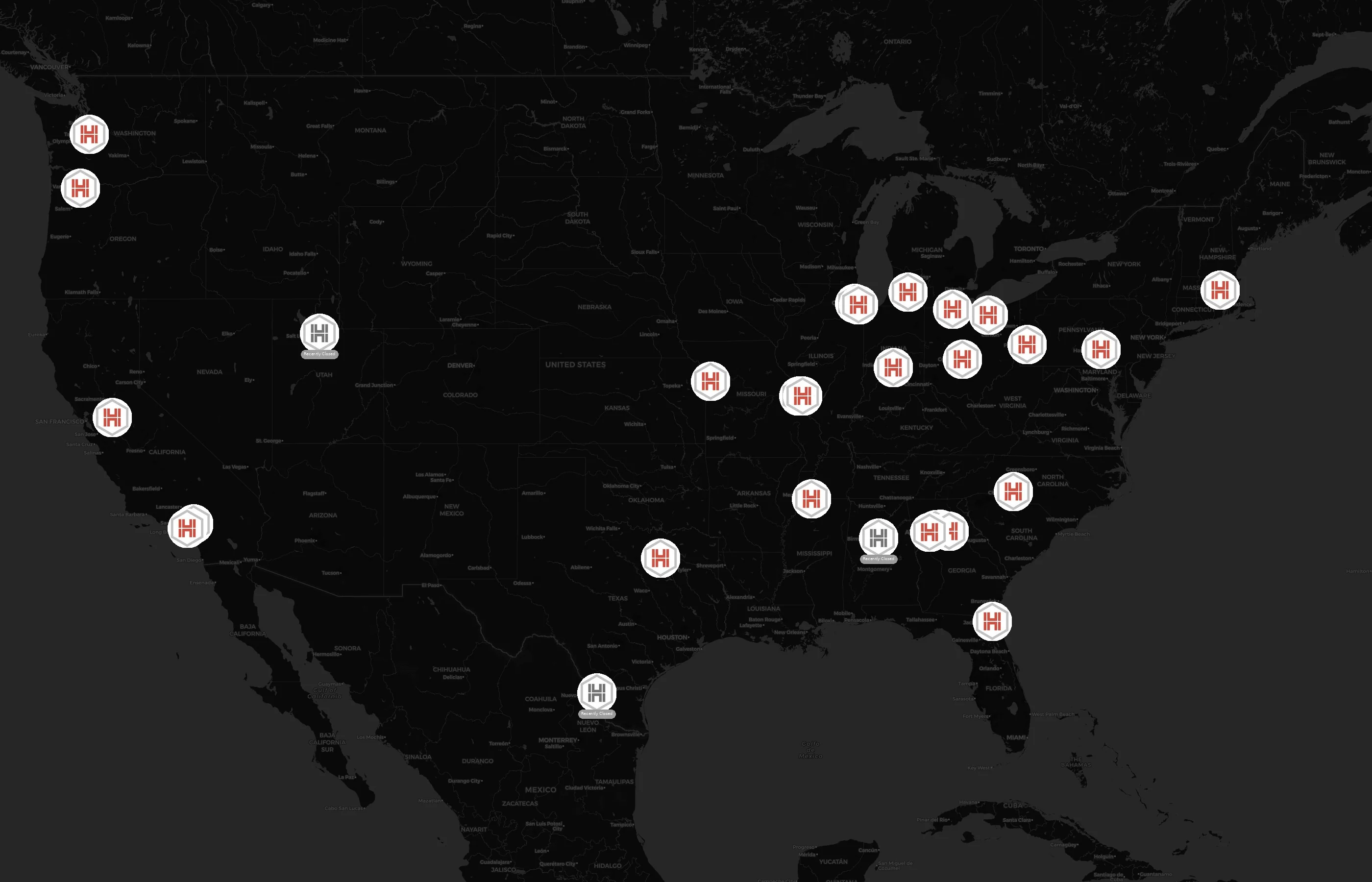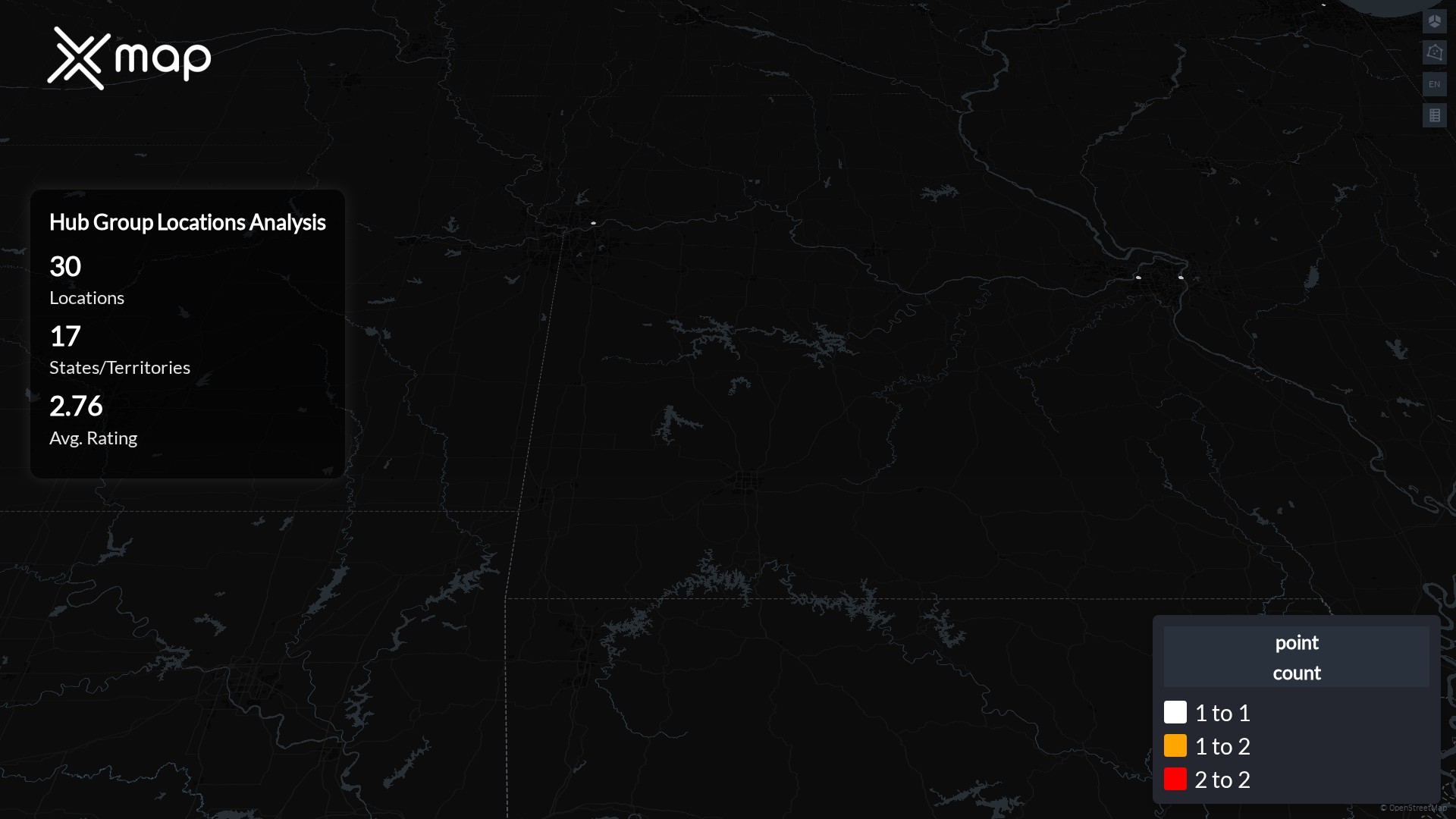Street-level clusters show corridors where multiple Hub Group locations sit within the same neighborhood indicating strong local presence and coherence. Hub Group operates a total of 30 nationwide.