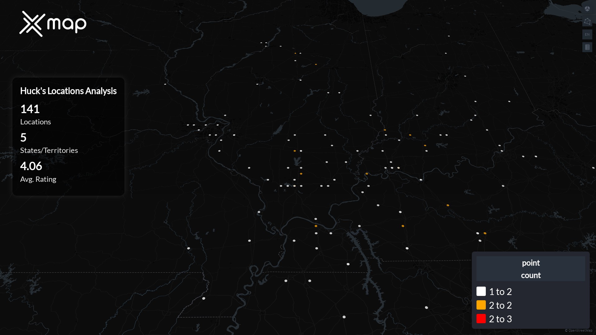 Street-level clusters show corridors where multiple Huck's locations sit within the same neighborhood indicating strong local presence and coherence. Huck's operates a total of 141 nationwide.
