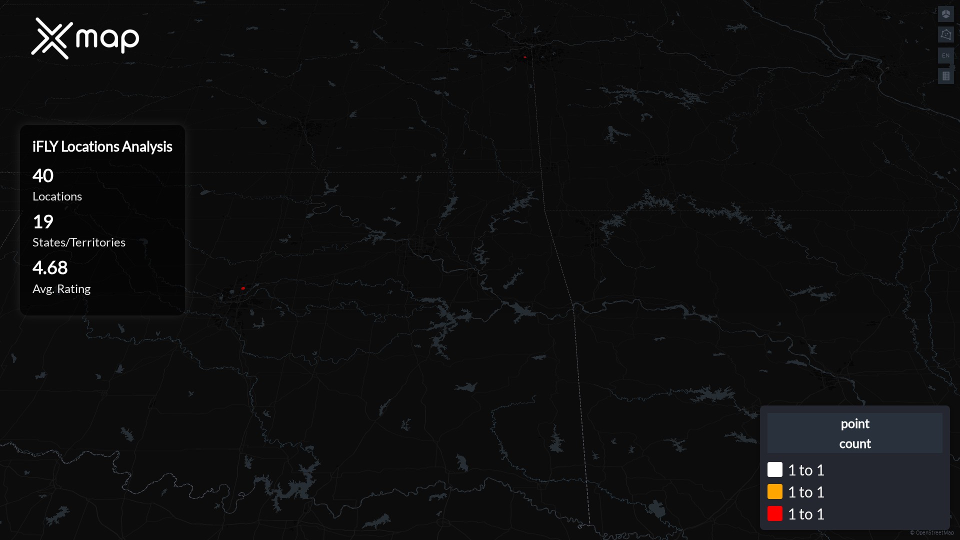 Street-level clusters show corridors where multiple iFLY locations sit within the same neighborhood indicating strong local presence and coherence. iFLY operates a total of 40 nationwide.