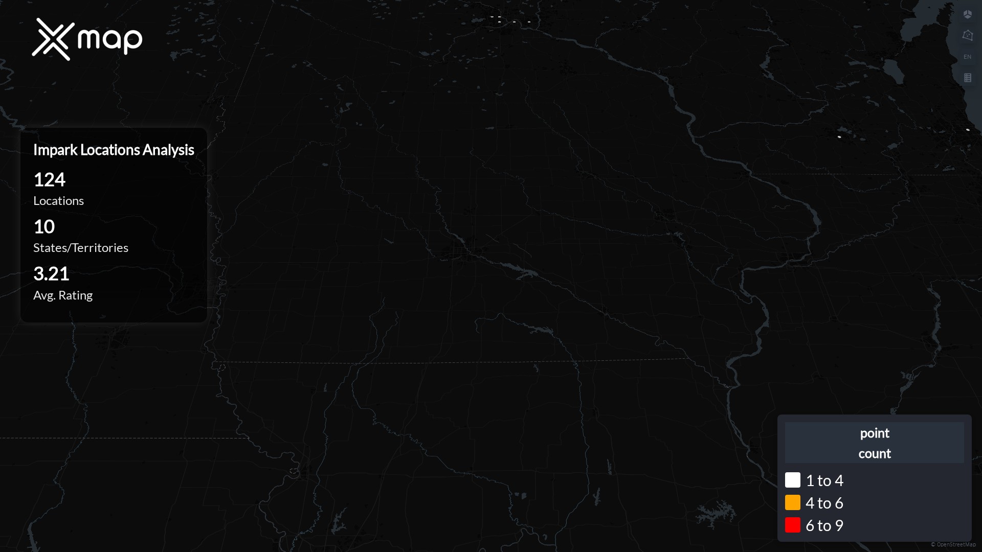Street-level clusters show corridors where multiple Impark locations sit within the same neighborhood indicating strong local presence and coherence. Impark operates a total of 124 nationwide.