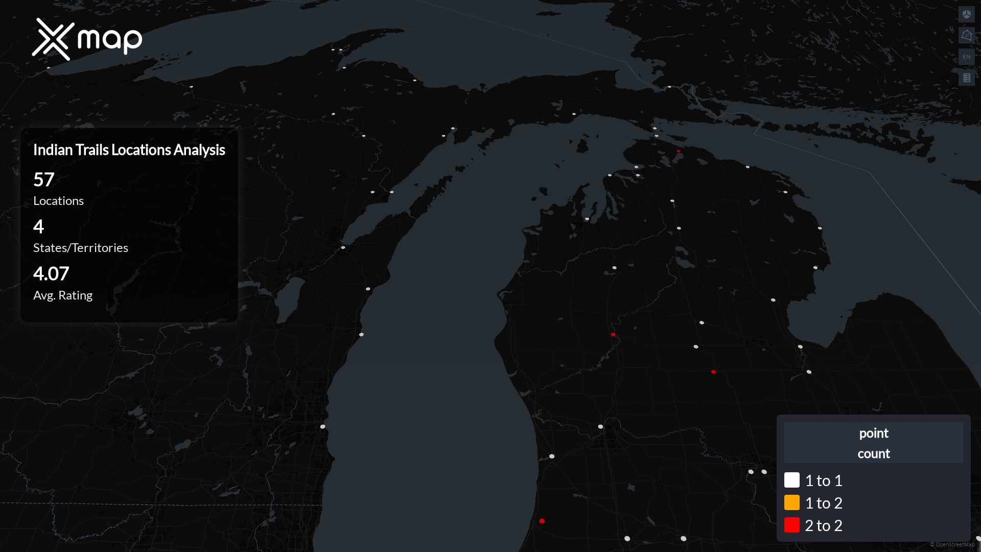 Indian Trails operates 57 United States of America locations across 4 states. Largest clusters are in Michigan, Wisconsin, and Indiana; the top 10 states contain 100.0% of sites. Coverage is thinner in Wisconsin, Indiana, and Minnesota.