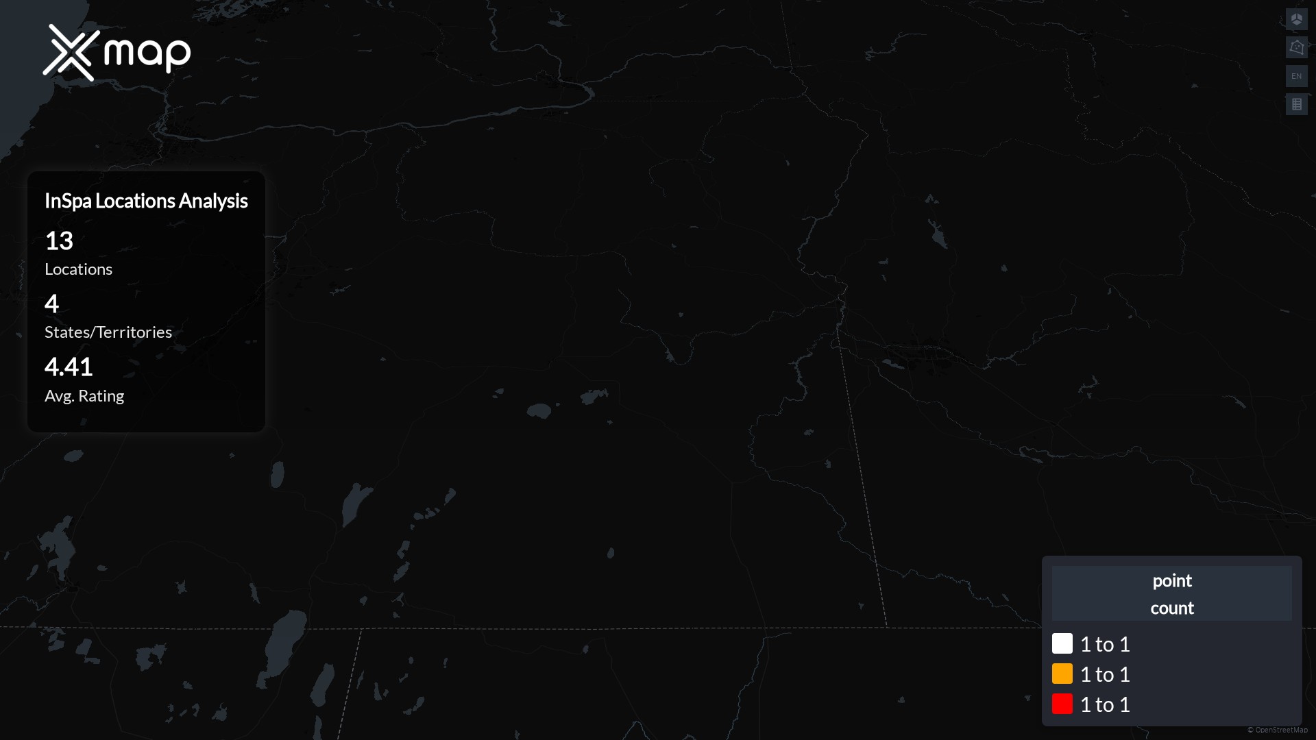 Street-level clusters show corridors where multiple InSpa locations sit within the same neighborhood indicating strong local presence and coherence. InSpa operates a total of 13 nationwide.