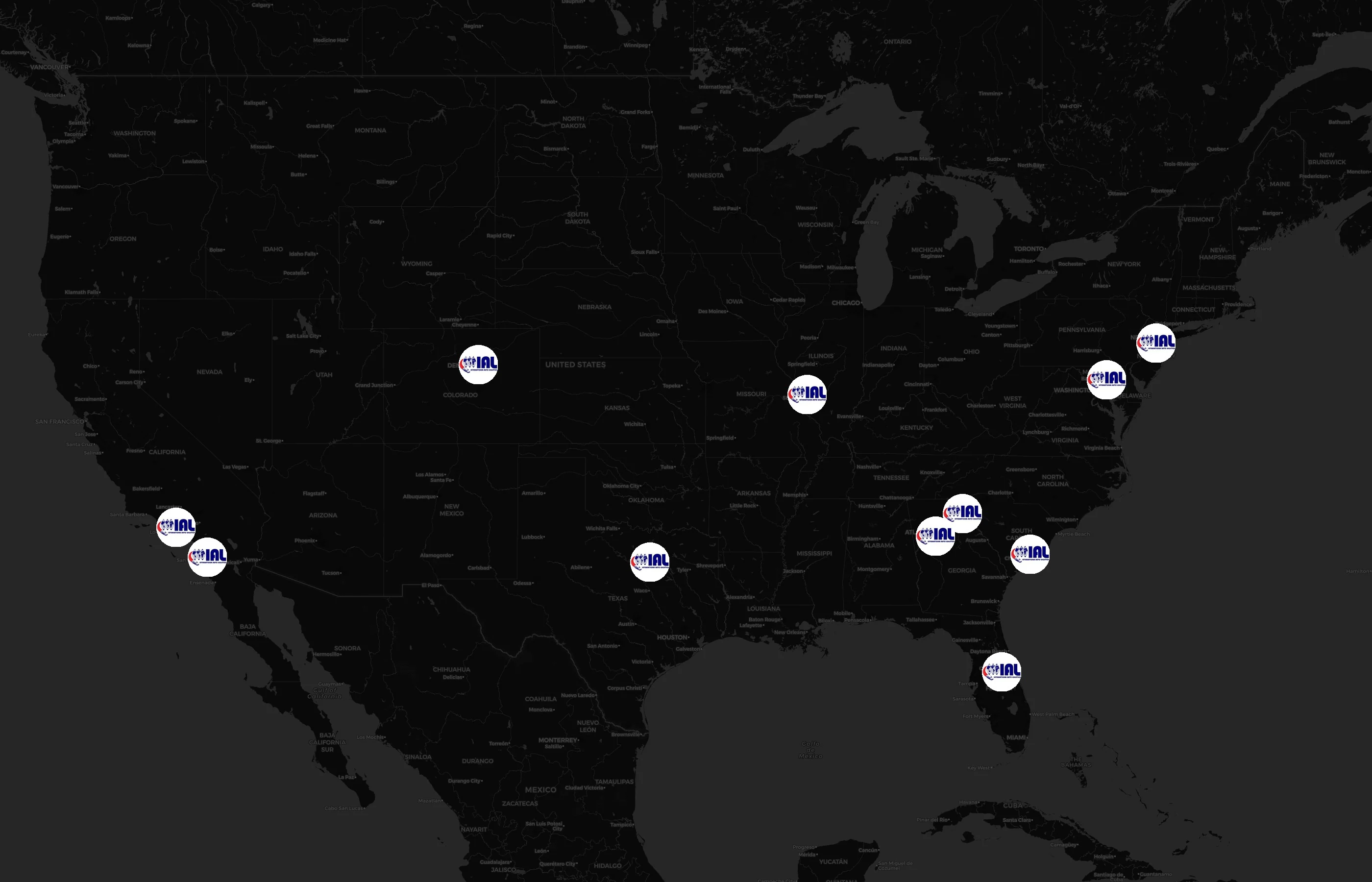 Street-level clusters show corridors where multiple International Auto Logistics locations sit within the same neighborhood indicating strong local presence and coherence. International Auto Logistics operates a total of 14 nationwide.