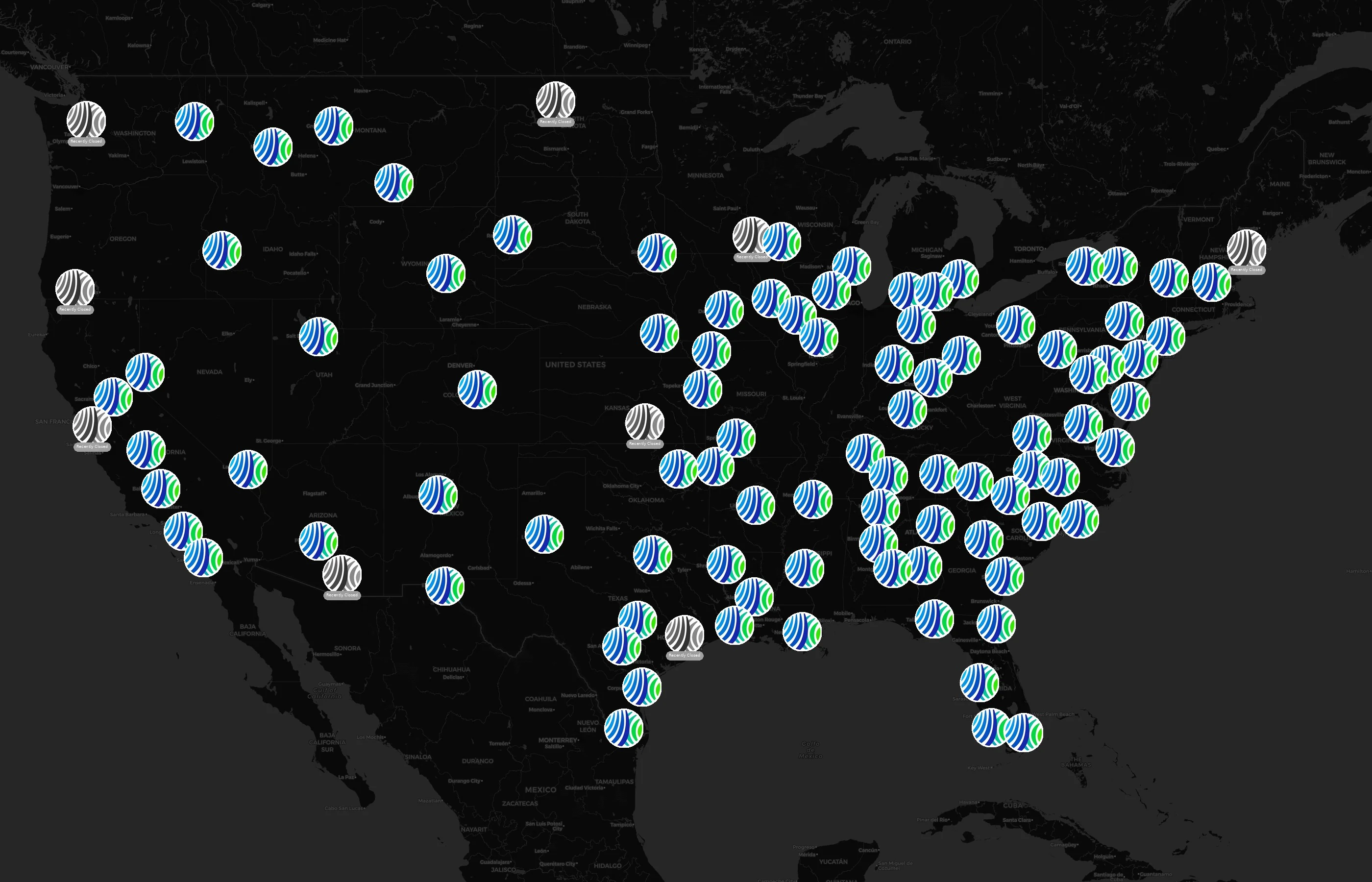 Locations concentrate around major metros such as Sedgwick, Albany, York, Jefferson, and Oakland. The top 10 cities account for 15.3% of U.S. sites.