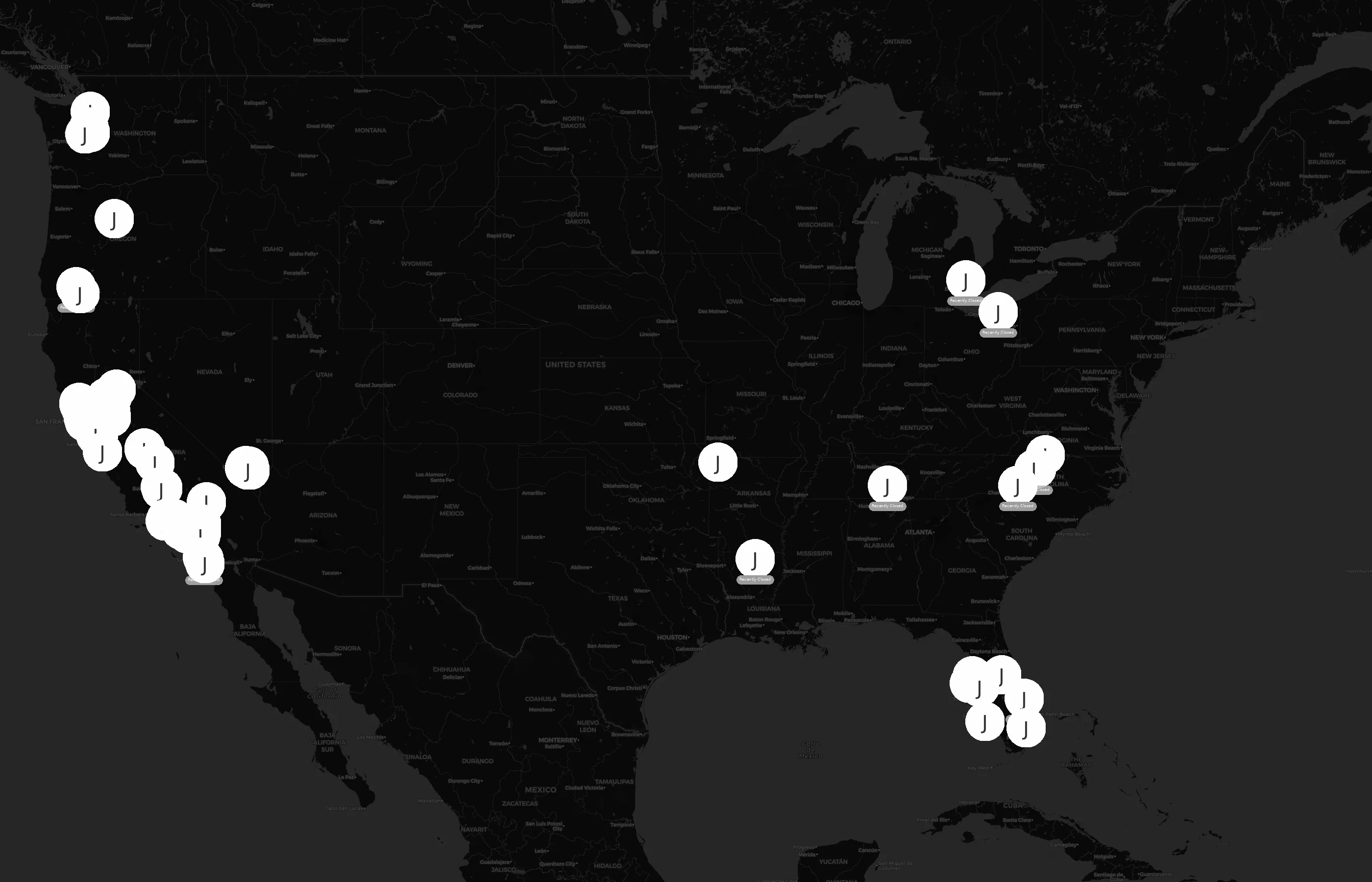 Just Digital Coin operates 278 United States of America locations across 12 states. Largest clusters are in California, Nevada, and Florida; the top 10 states contain 99.3% of sites. Coverage is thinner in Michigan, Ohio, and Virginia.