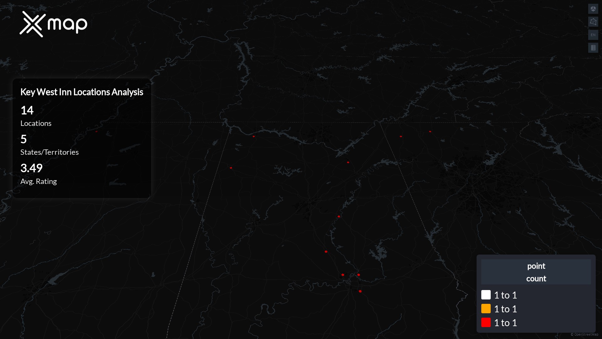 Street-level clusters show corridors where multiple Key West Inn locations sit within the same neighborhood indicating strong local presence and coherence. Key West Inn operates a total of 14 nationwide.