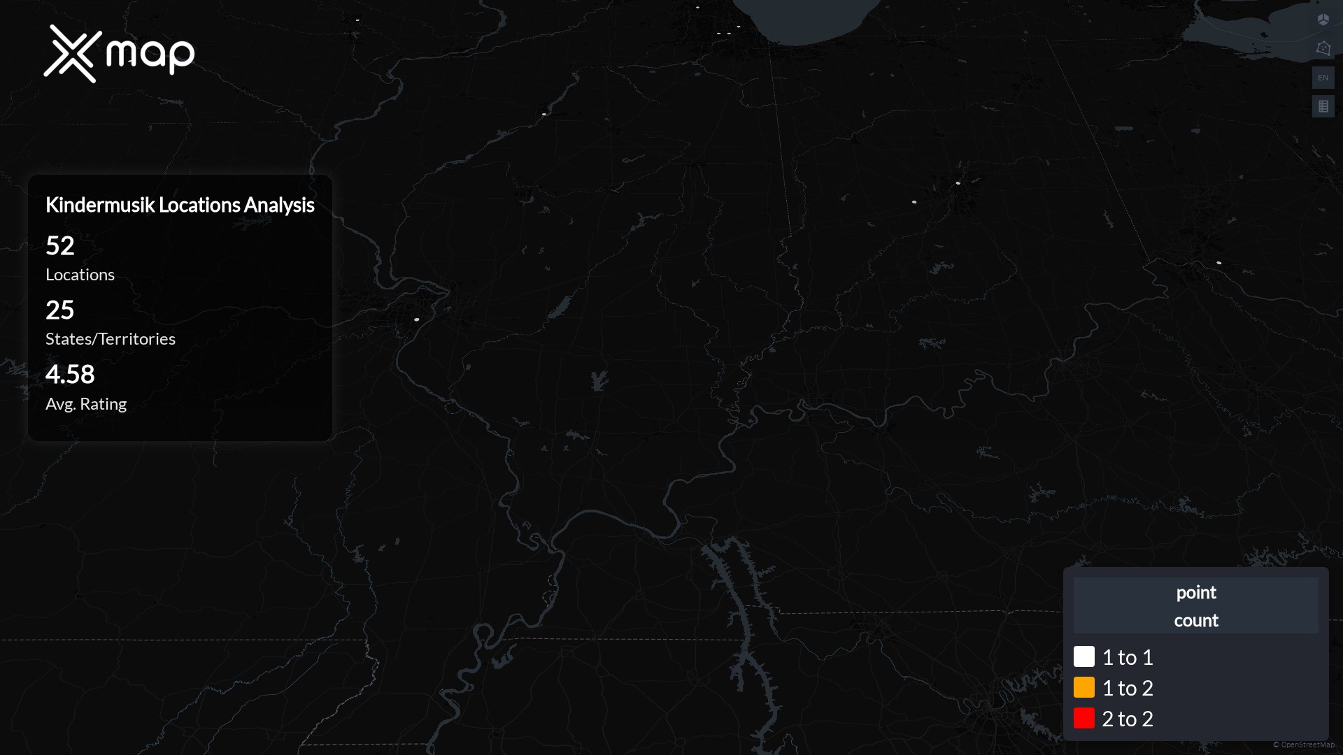 Street-level clusters show corridors where multiple Kindermusik locations sit within the same neighborhood indicating strong local presence and coherence. Kindermusik operates a total of 52 nationwide.