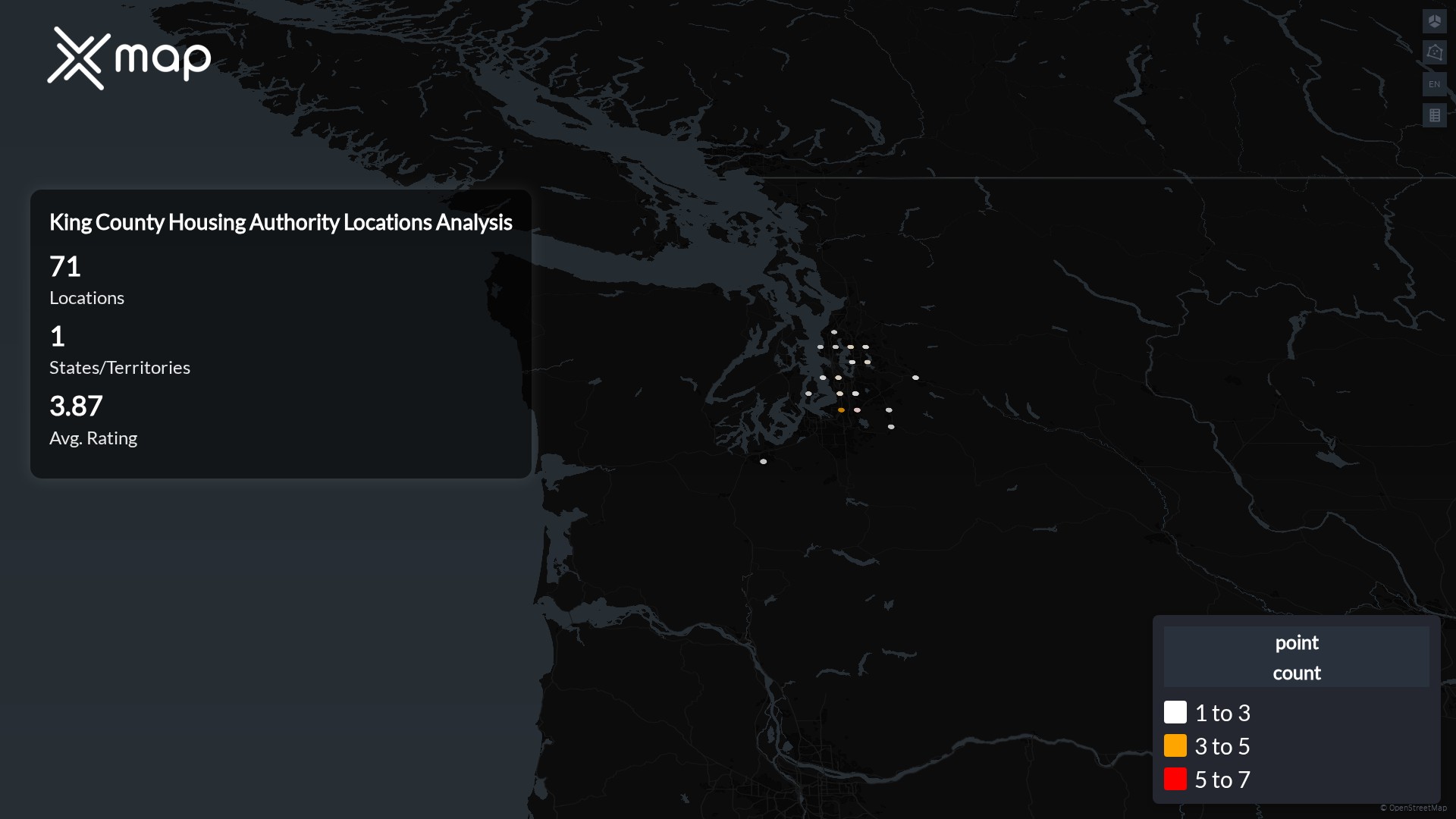 Street-level clusters show corridors where multiple King County Housing Authority locations sit within the same neighborhood indicating strong local presence and coherence. King County Housing Authority operates a total of 71 nationwide.