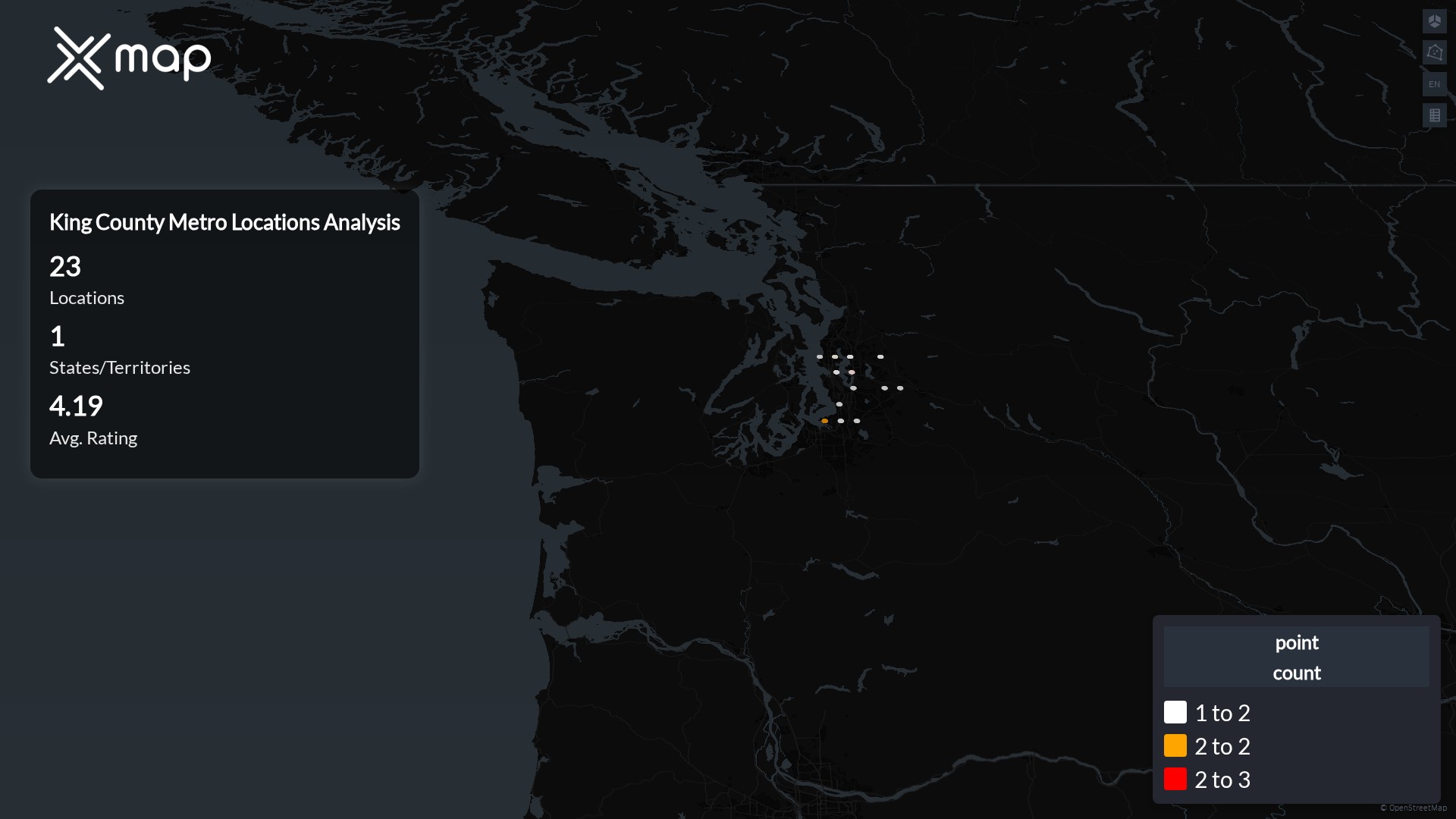 Street-level clusters show corridors where multiple King County Metro locations sit within the same neighborhood indicating strong local presence and coherence. King County Metro operates a total of 23 nationwide.