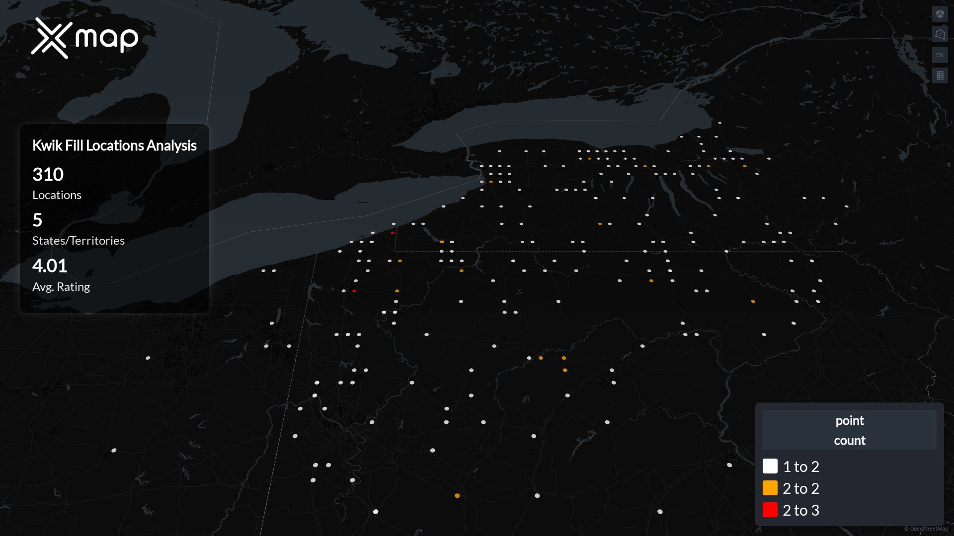 Kwik Fill has a total of 310 locations across the United States, with over 99% concentrated in New York (163 locations, 52.6%), Pennsylvania (138 locations, 44.5%), and Ohio (7 locations, 2.3%). Pennsylvania offers the best access with one location per 94,125 people, while Ohio is the most stretched with one location per 1,682,098 people. The remaining locations are sparsely distributed in New Jersey and South Carolina, each with a single outlet.