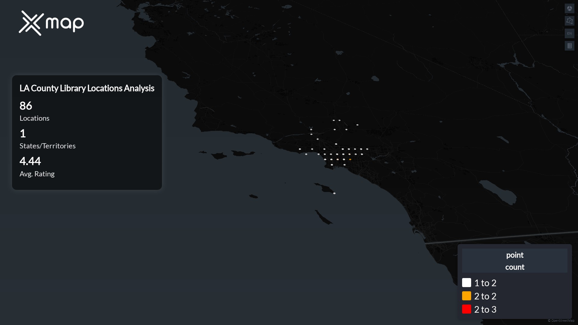 LA County Library POI data enables clear measurement of footprint and demand. Analysts can rank states and cities by location count, compare coverage on a per-capita basis, and use traffic scores and review volumes to spot high-performing markets and under-served pockets. The result is an objective view of saturation, growth opportunities, and performance outliers.