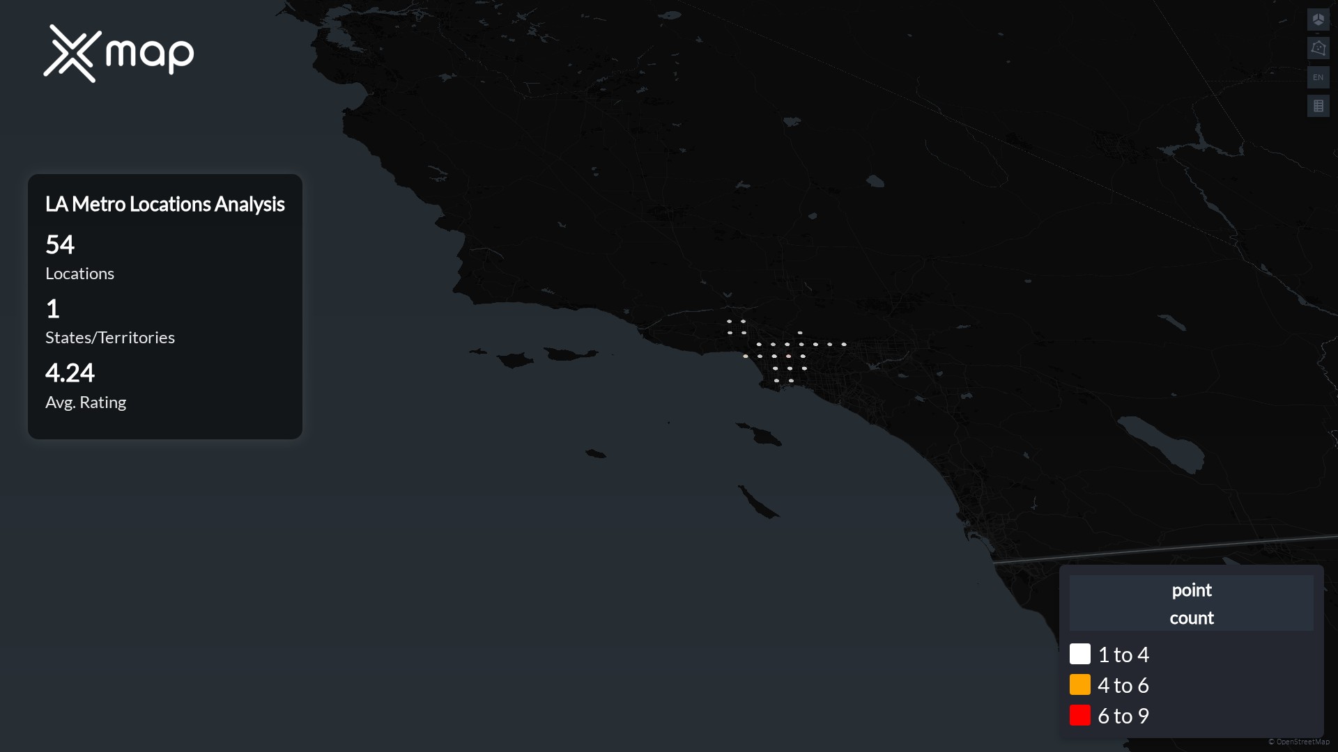 Street-level clusters show corridors where multiple LA Metro locations sit within the same neighborhood indicating strong local presence and coherence. LA Metro operates a total of 54 nationwide.