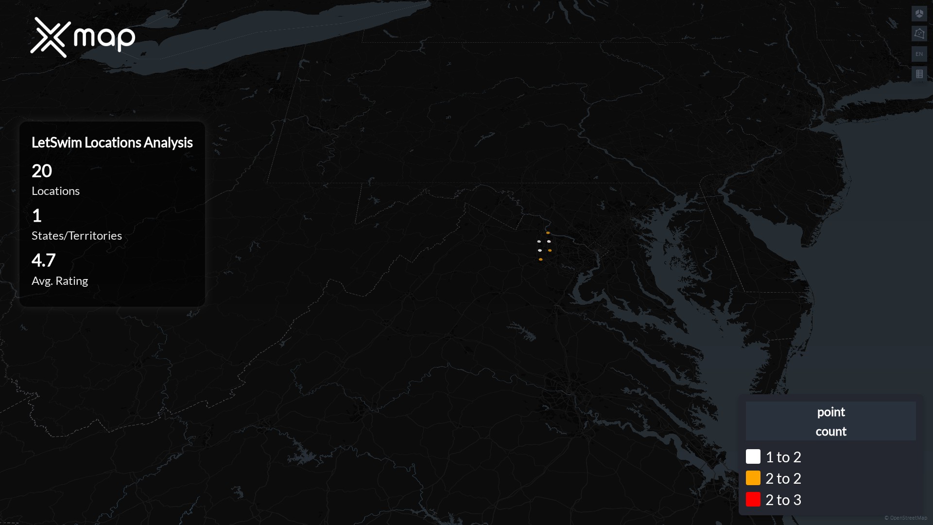 Street-level clusters show corridors where multiple LetSwim locations sit within the same neighborhood indicating strong local presence and coherence. LetSwim operates a total of 20 nationwide.