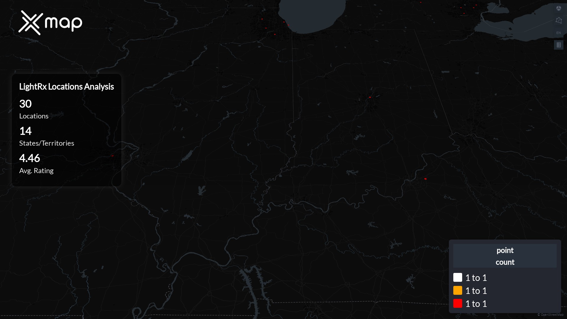Street-level clusters show corridors where multiple LightRx locations sit within the same neighborhood indicating strong local presence and coherence. LightRx operates a total of 30 nationwide.