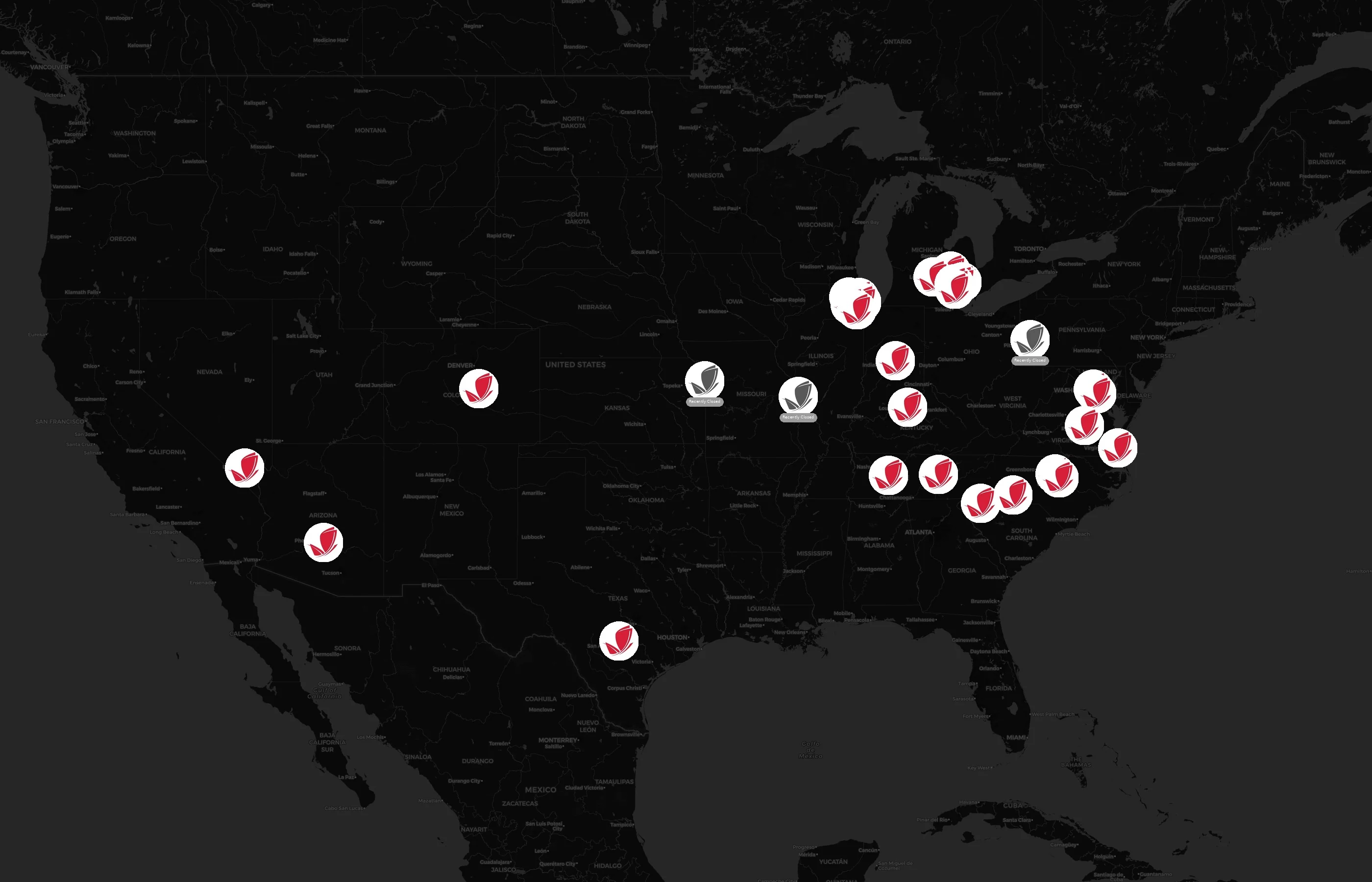 Locations concentrate around major metros such as Cook, Oakland, Fairfax, Bexar, and Clark. The top 10 cities account for 53.3% of U.S. sites.