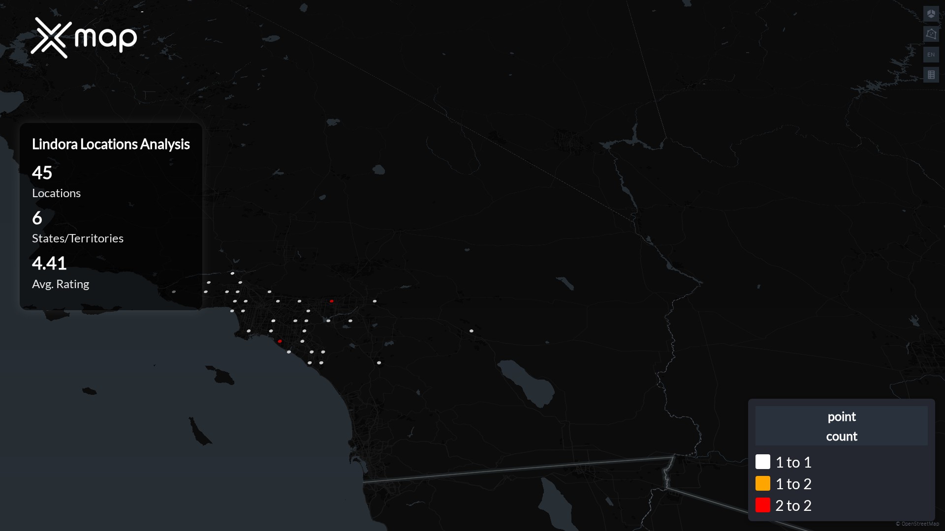 Lindora POI data enables clear measurement of footprint and demand. Analysts can rank states and cities by location count, compare coverage on a per-capita basis, and use traffic scores and review volumes to spot high-performing markets and under-served pockets. The result is an objective view of saturation, growth opportunities, and performance outliers.