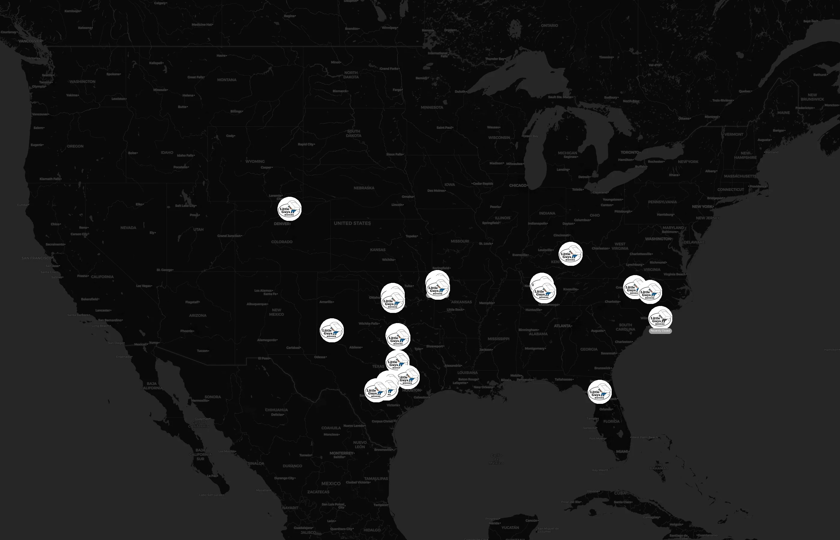 Little Guys Movers operates 20 United States of America locations across 8 states. Largest clusters are in Texas, NorthCarolina, and Arkansas; the top 10 states contain 100.0% of sites. Coverage is thinner in Colorado, Florida, and Kentucky.